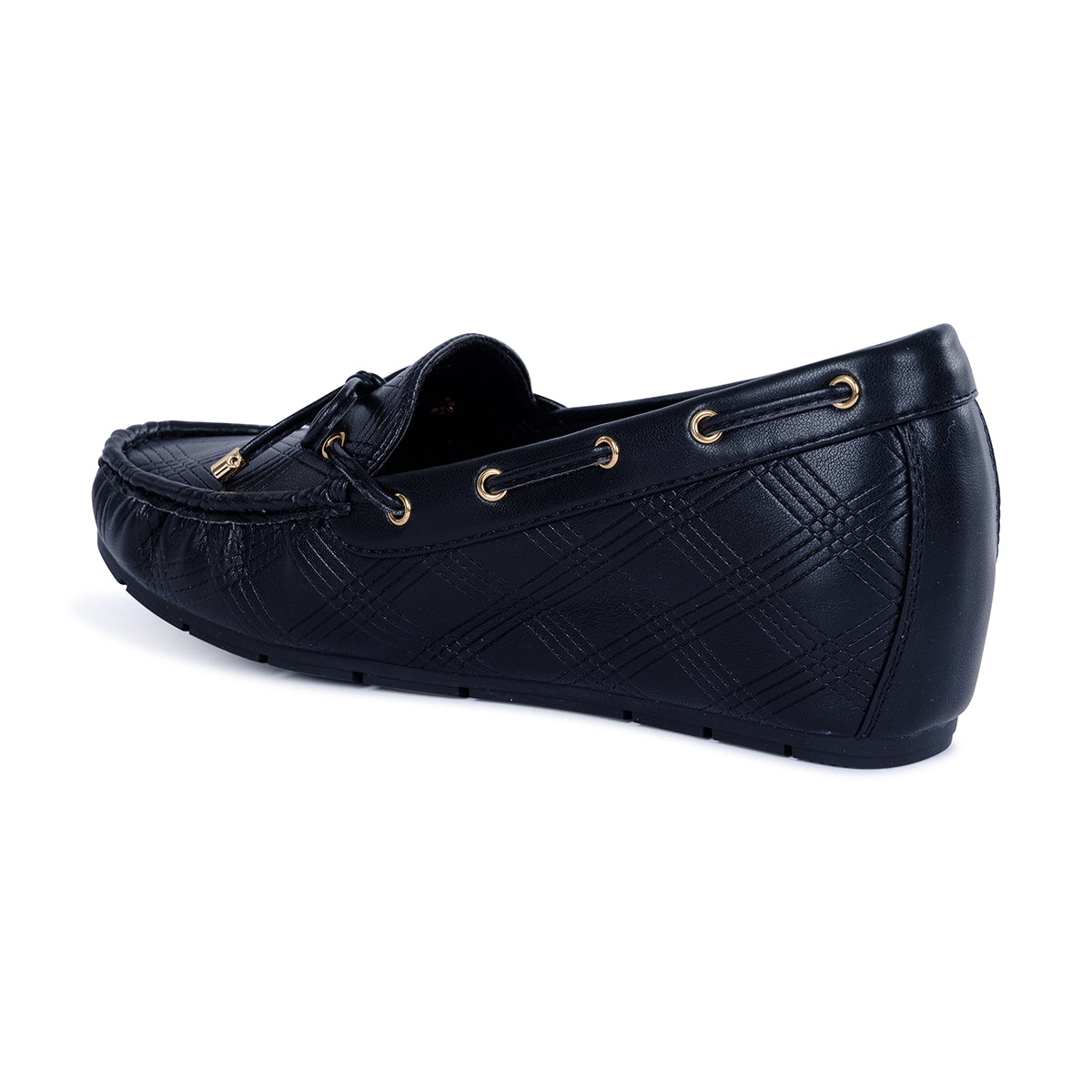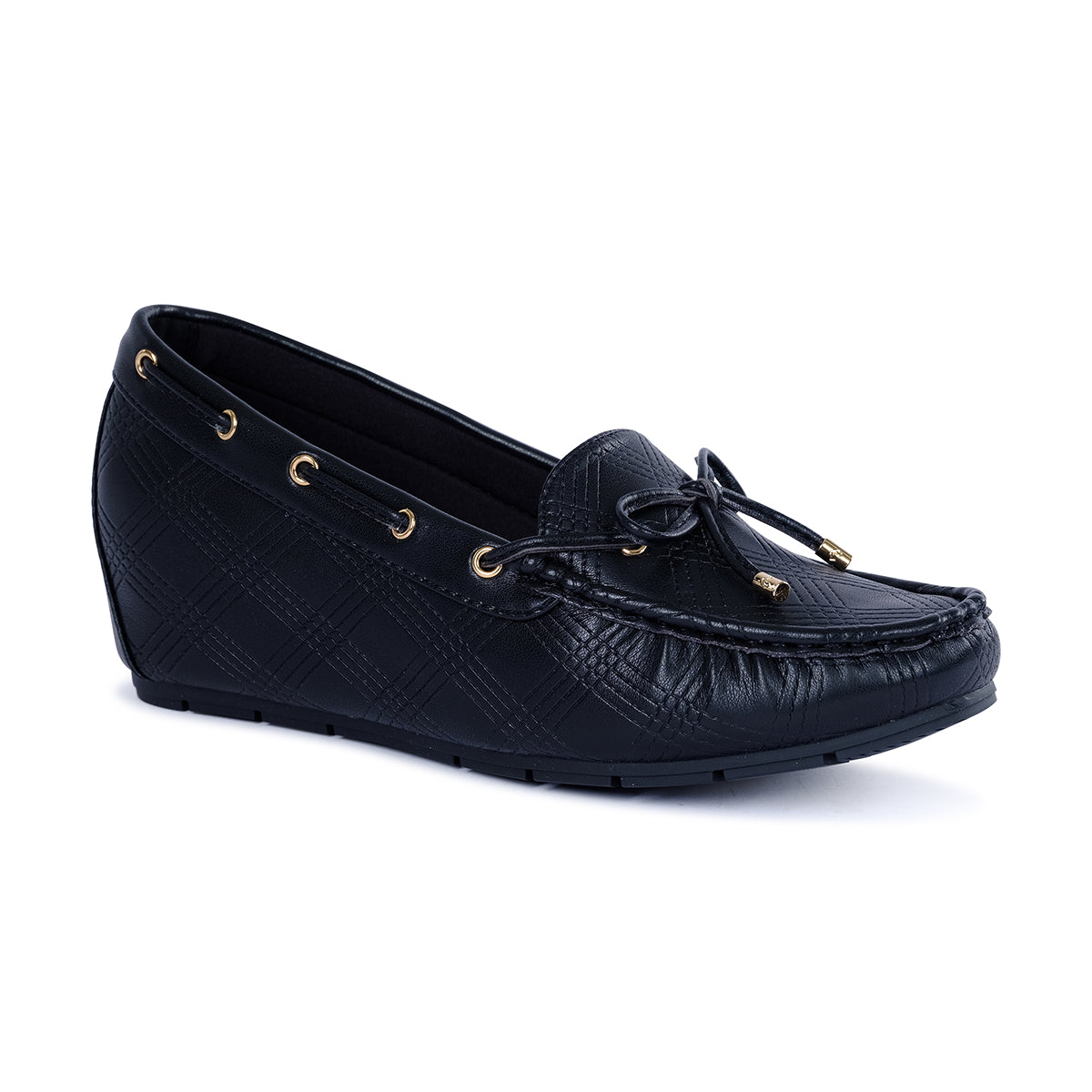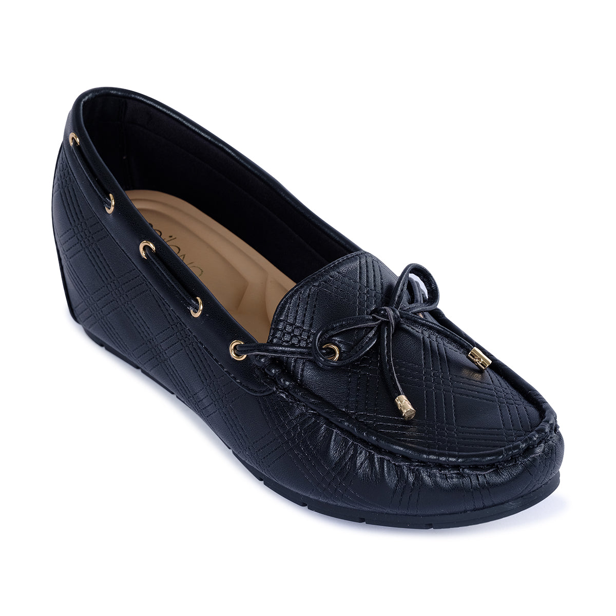 Chic black moccasins featuring gold-tone eyelet detailing and bow accents, paired with a subtle wedge heel for added sophistication and comfort.