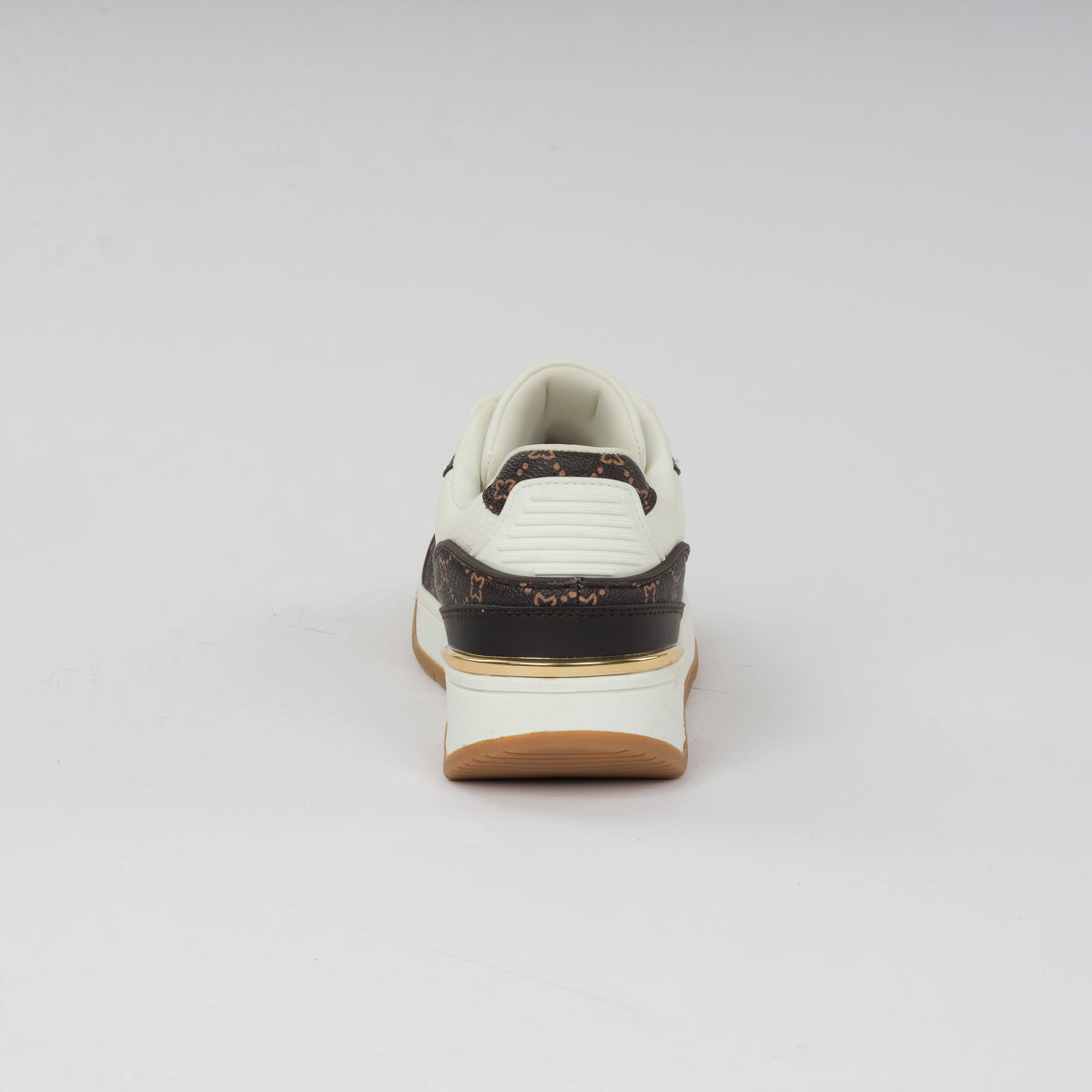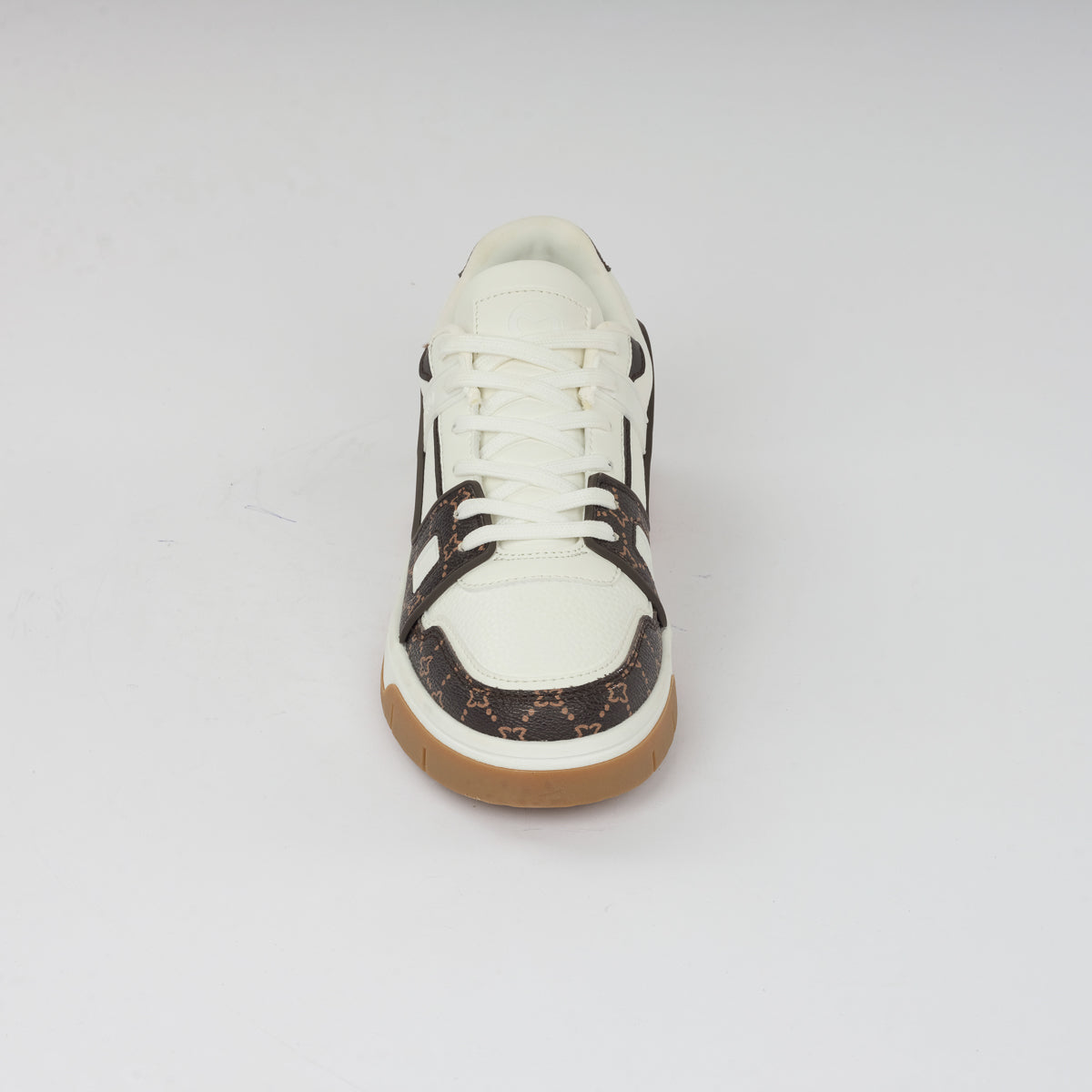 Elevate your look with these modern white sneakers featuring bold brown monogram overlays and a chunky sole for ultimate style and comfort.