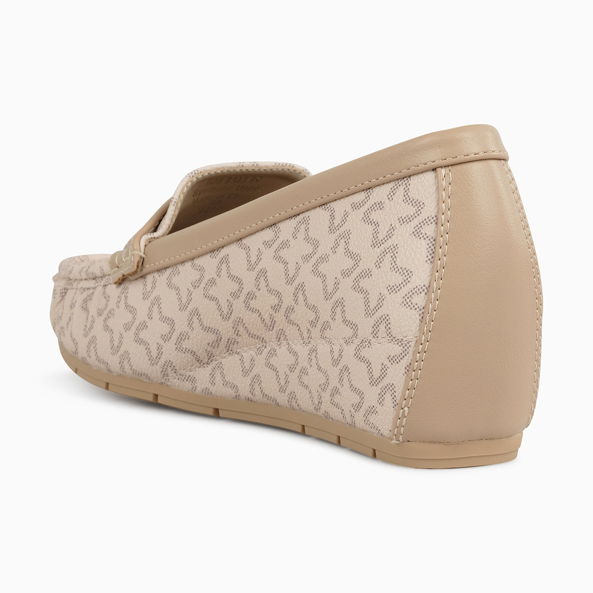 Classic wedge moccasin featuring an all-over monogram pattern with smooth leather trim and a sleek metal accent. Designed with a cushioned footbed and durable sole for everyday comfort and style.