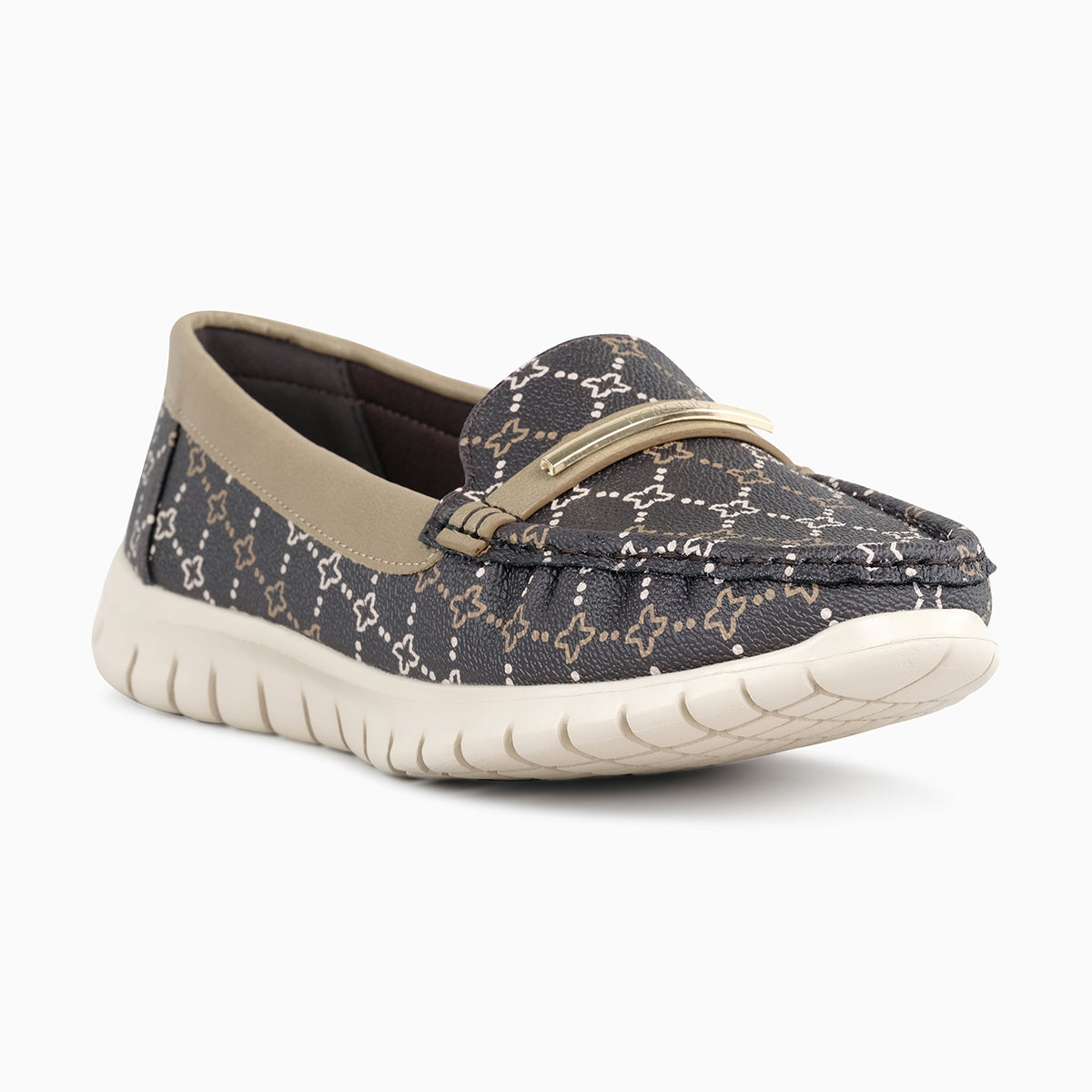 Comfortable loafers featuring an all-over monogram pattern, sleek trim, and a decorative metal accent. Designed with a cushioned footbed and lightweight flexible sole for everyday wear