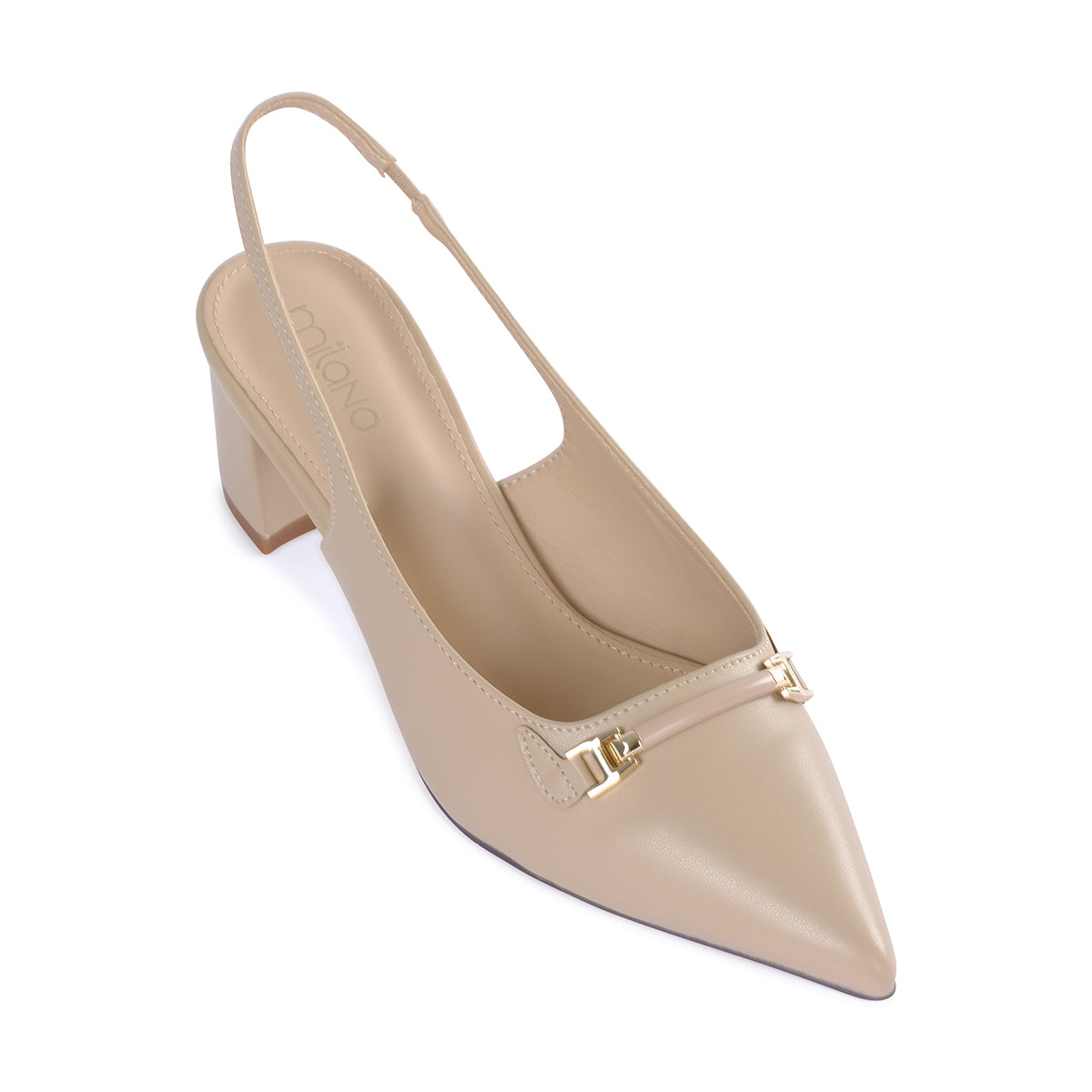 Refined beige slingback pumps with a pointed toe, block heel, and subtle metallic accent for a polished, modern look.