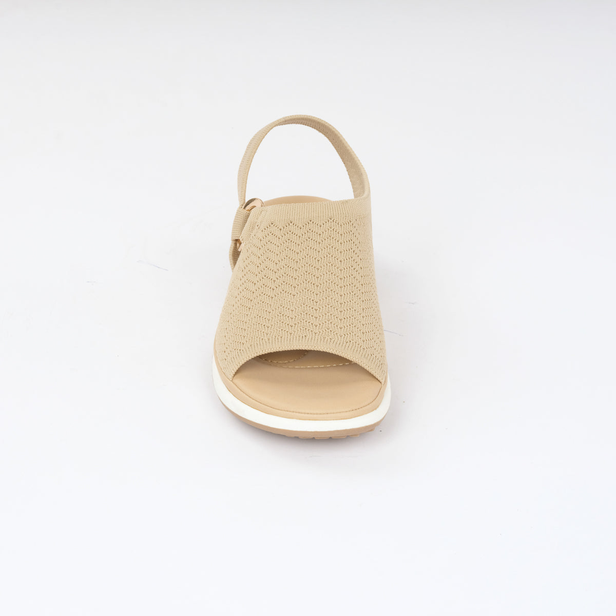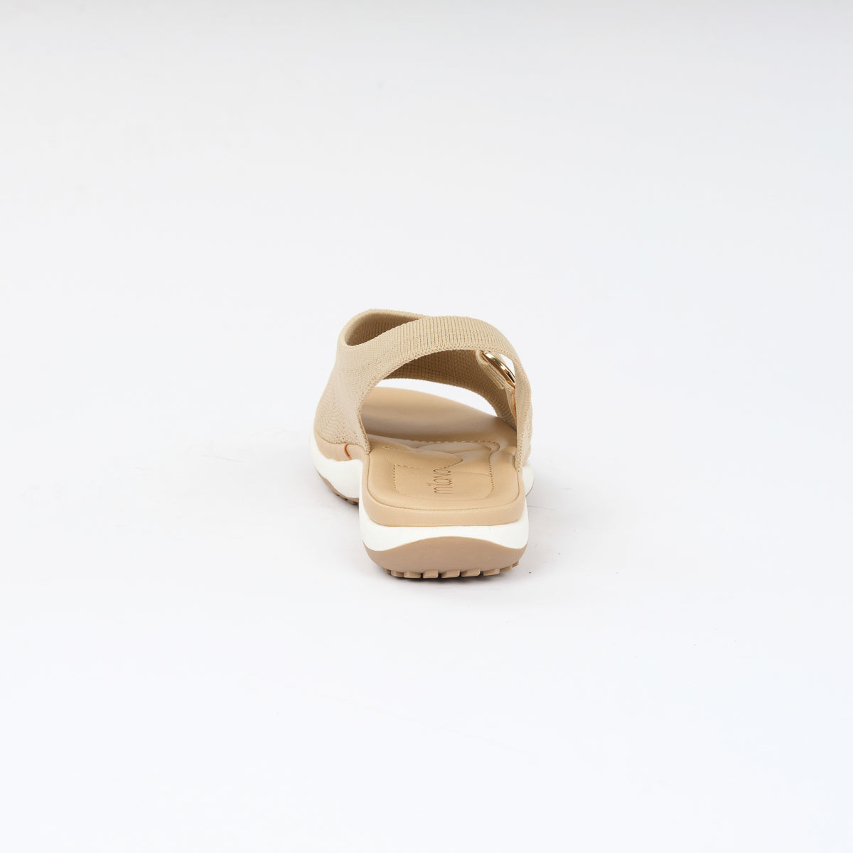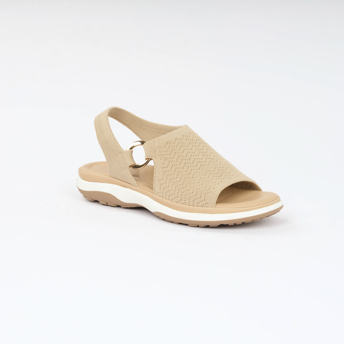 Beige open-toe sandals with a textured upper, metallic ring accents, and a cushioned sole for all-day comfort and modern style.