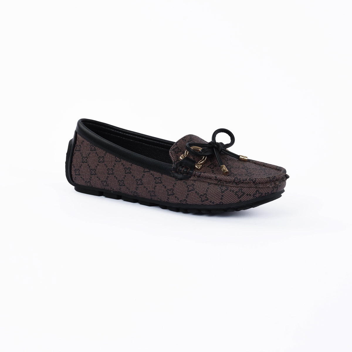 Classic brown monogram moccasins with a sleek slip-on design, accented by a chic bow and metallic details. Perfect for effortless sophistication and all-day comfort.
