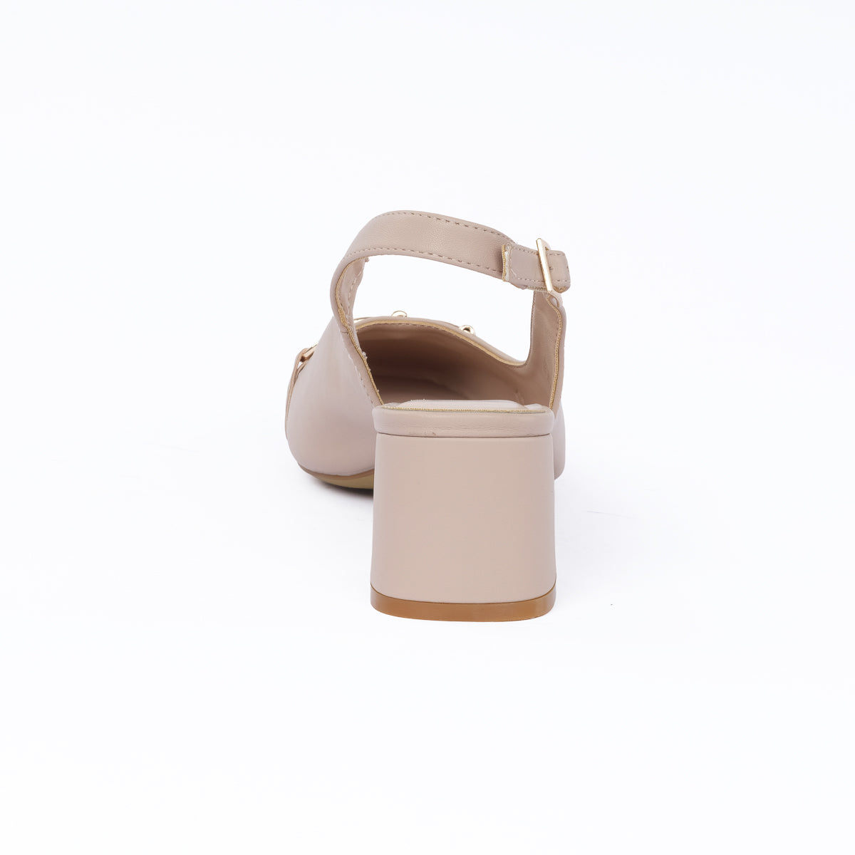 A modern slingback block heel with a rounded toe and a polished metal trim accent, offering a sophisticated look for both office and casual wear.