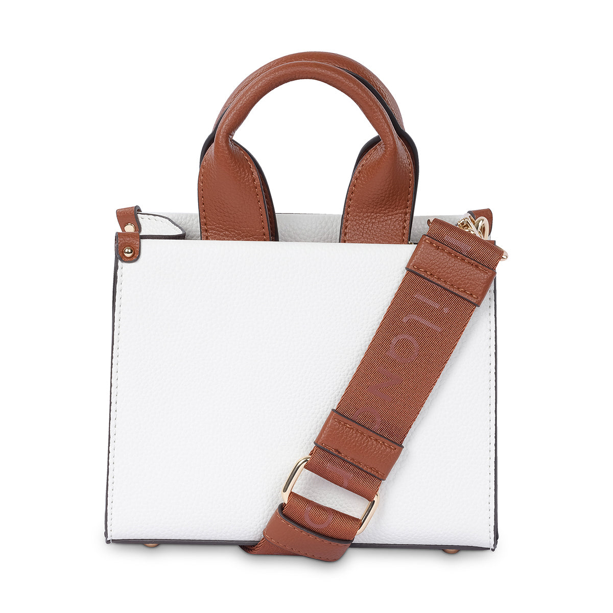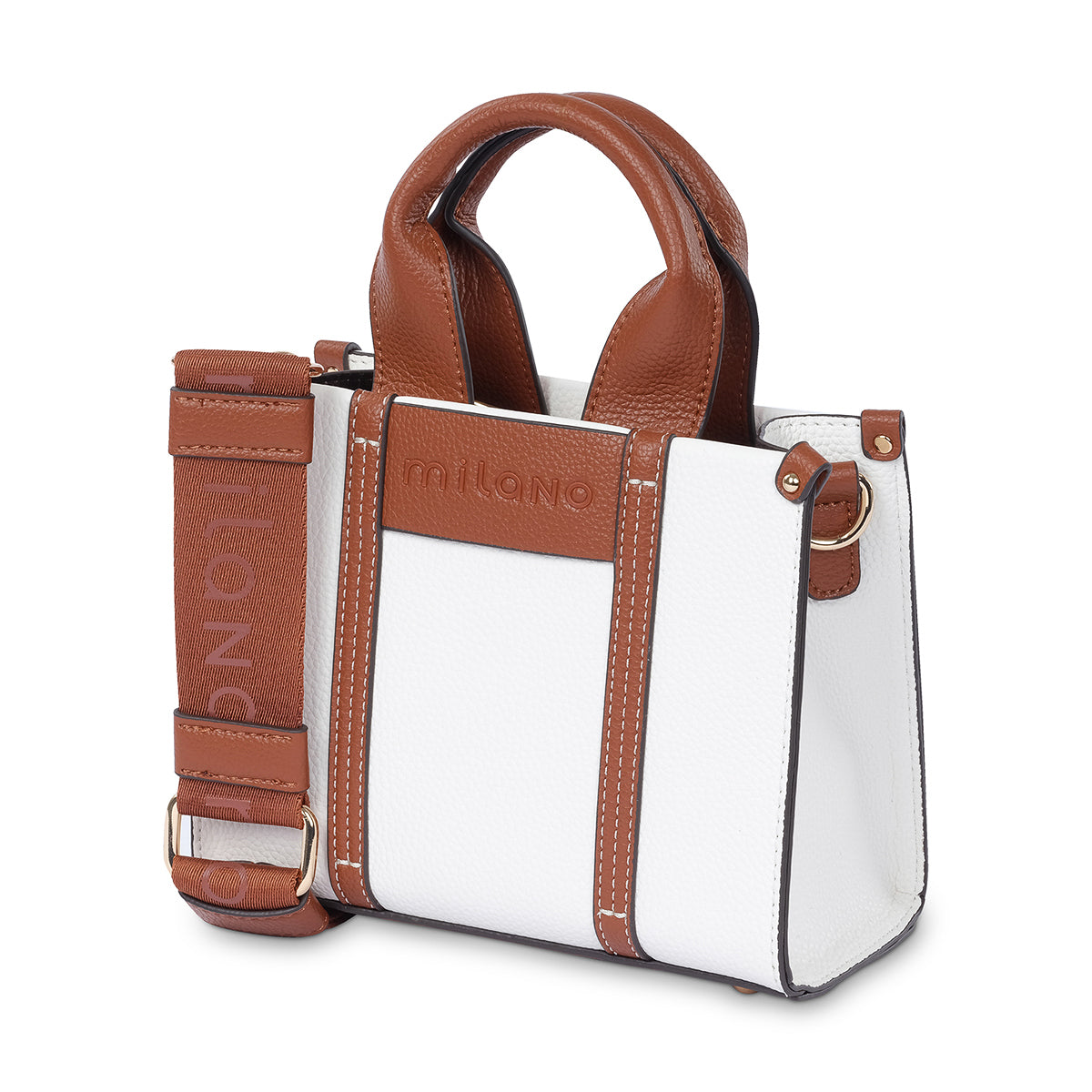 Cream grainy faux leather tote with contrasting tan panelling and a stylish tonal Milano logo. Featuring main zip closure and internal phone pockets for added security, as well as a premium Milano branded and adjustable webbing strap