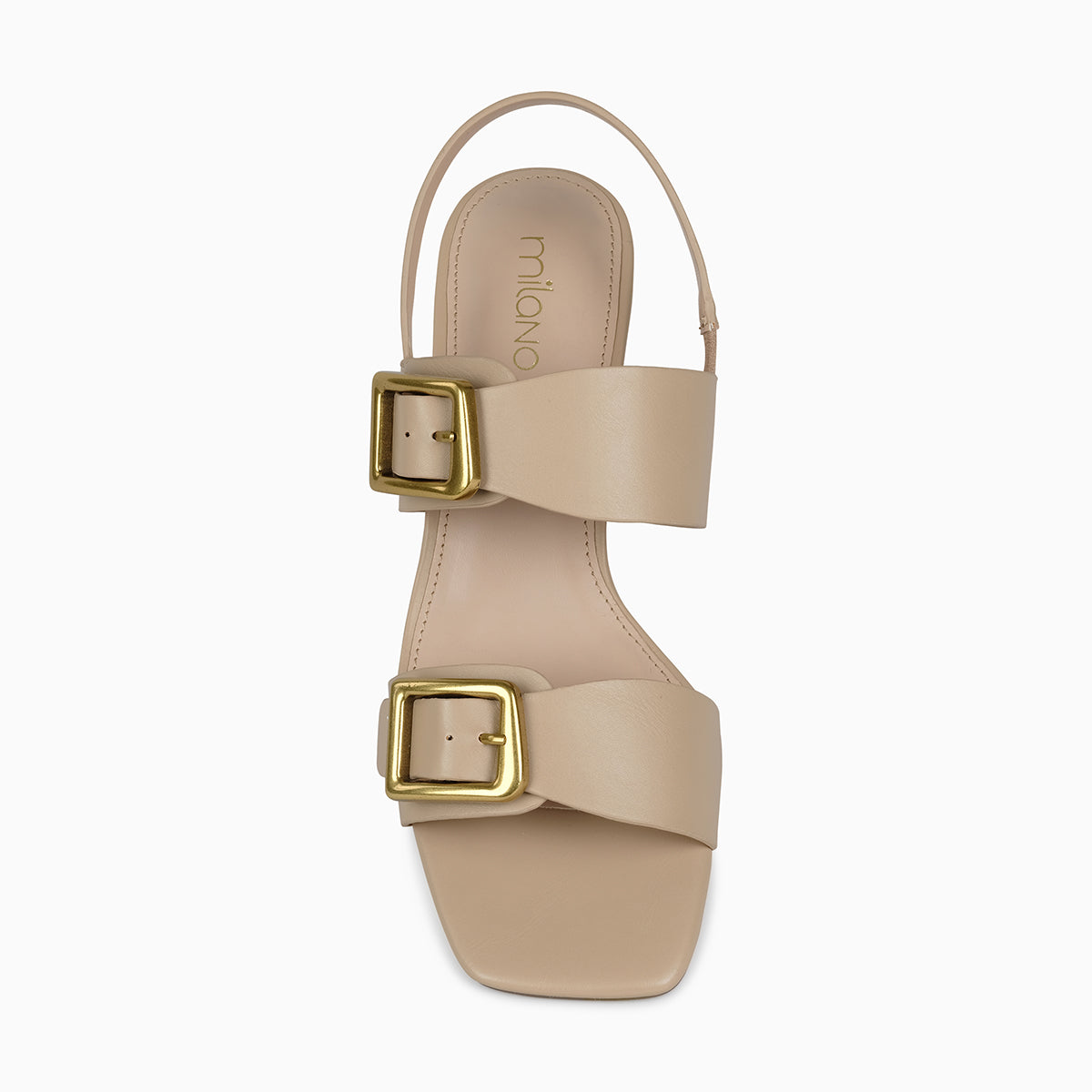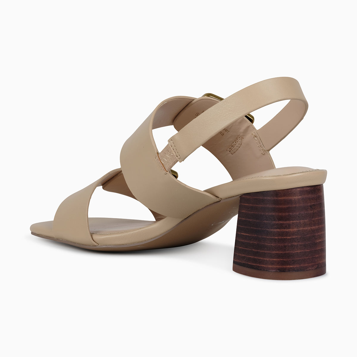 Sophisticated beige block-heel sandal featuring two wide straps with bold gold-tone buckle accents and an adjustable slingback for a secure fit. Designed with a sturdy mid-height heel for comfort and style, perfect for day-to-night wear.