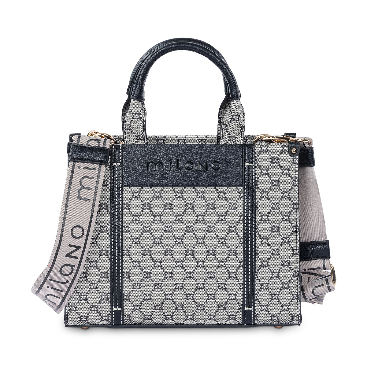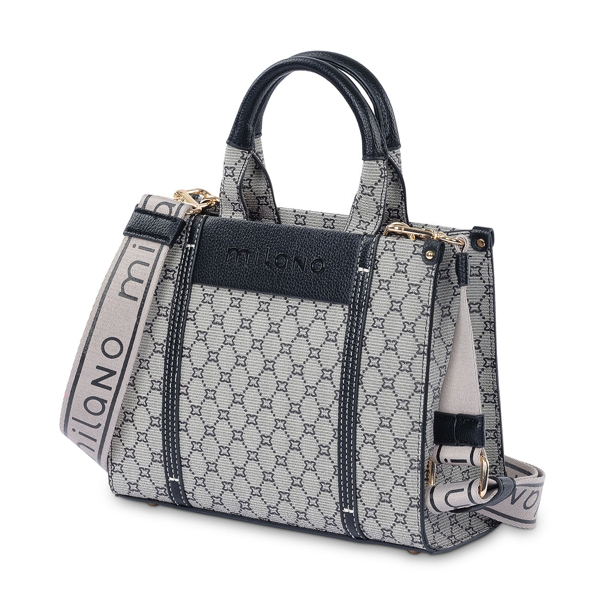 Grey and black monogram tote with contrasting black faux leather and a stylish tonal Milano logo. Featuring main zip closure and internal phone pockets for added security, as well as a premium Milano branded and adjustable webbing strap