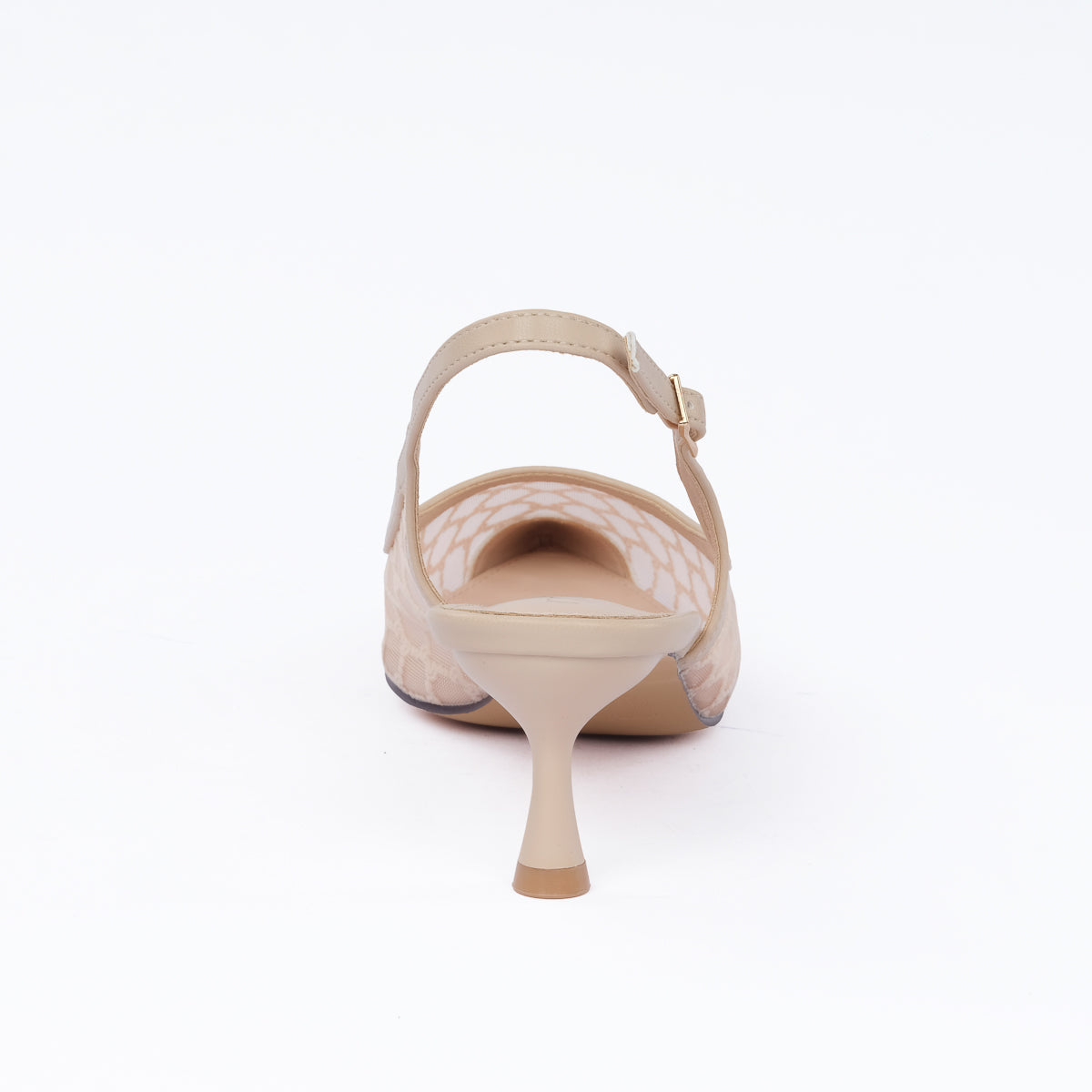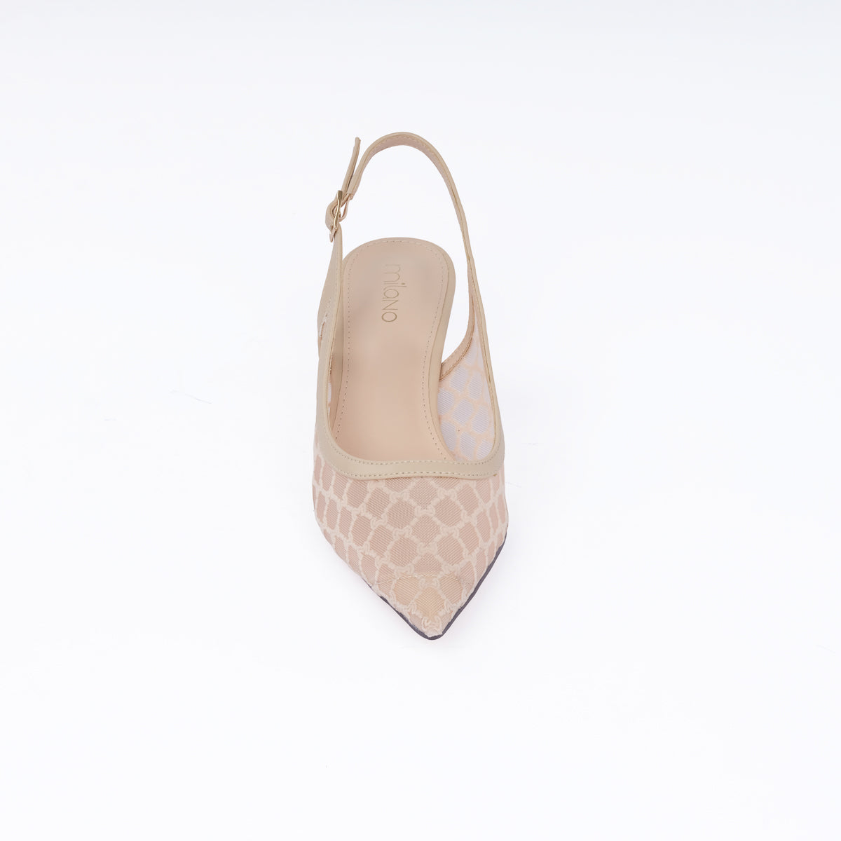 These Olivia slingback pumps feature the brand's signature "M" monogram on a delicate mesh upper. With a sophisticated pointed toe and a modern flared heel, they blend classic design with contemporary style. The adjustable ankle strap with a gold-toned buckle ensures a secure fit, making them a versatile choice for both day and evening wear.