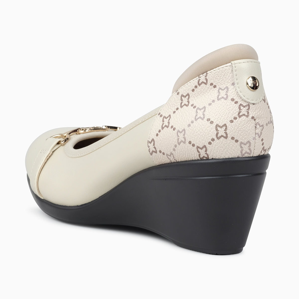 Elegant beige slip-on wedge shoe featuring a smooth leather-like upper with embossed logo detail, patterned heel counter, and cushioned insole for superior comfort. Designed with a sleek black wedge sole for added height and everyday wearability