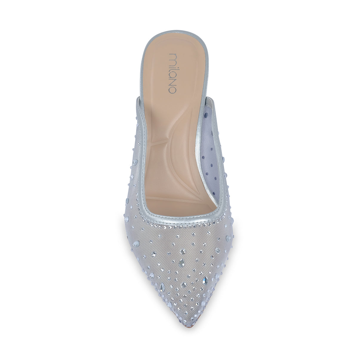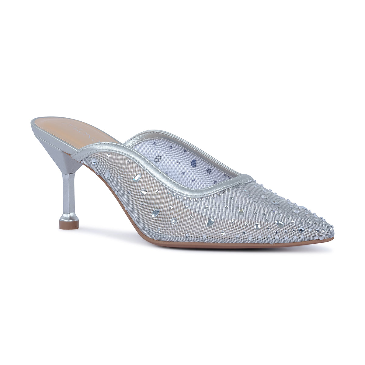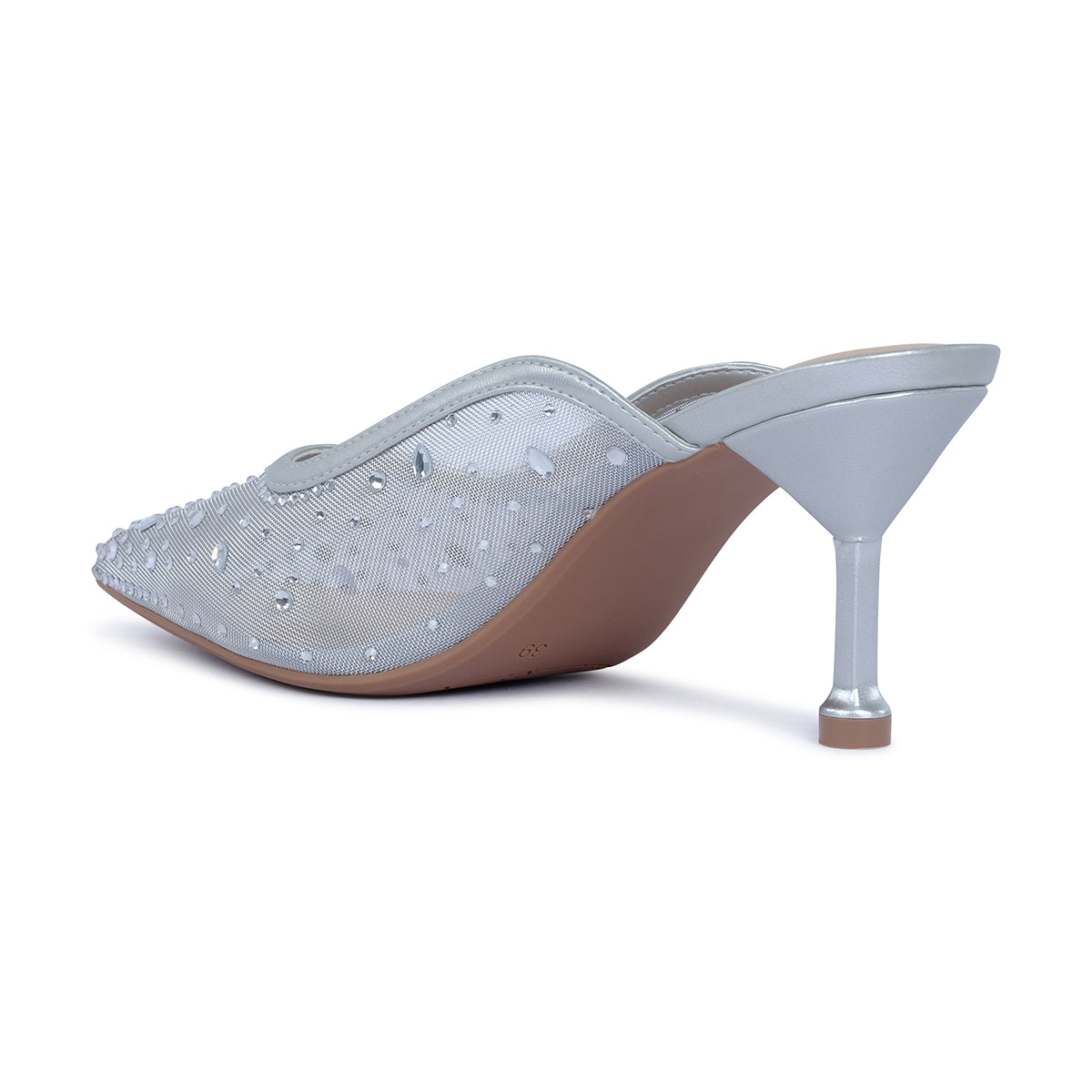Elegant mule heels featuring a pointed toe and sparkling crystal embellishments. Designed with a slim stiletto heel for a glamorous finish, perfect for parties and special occasions.