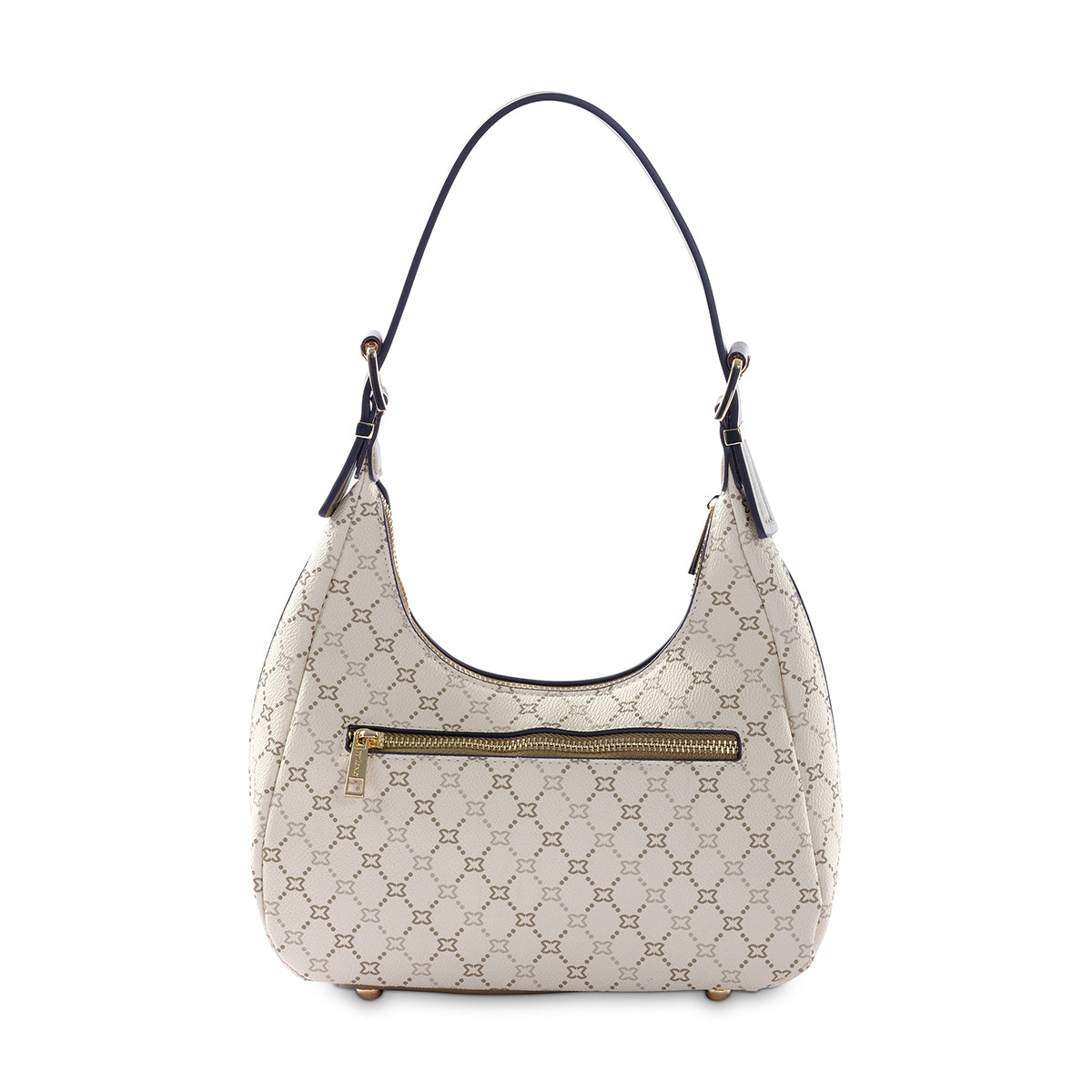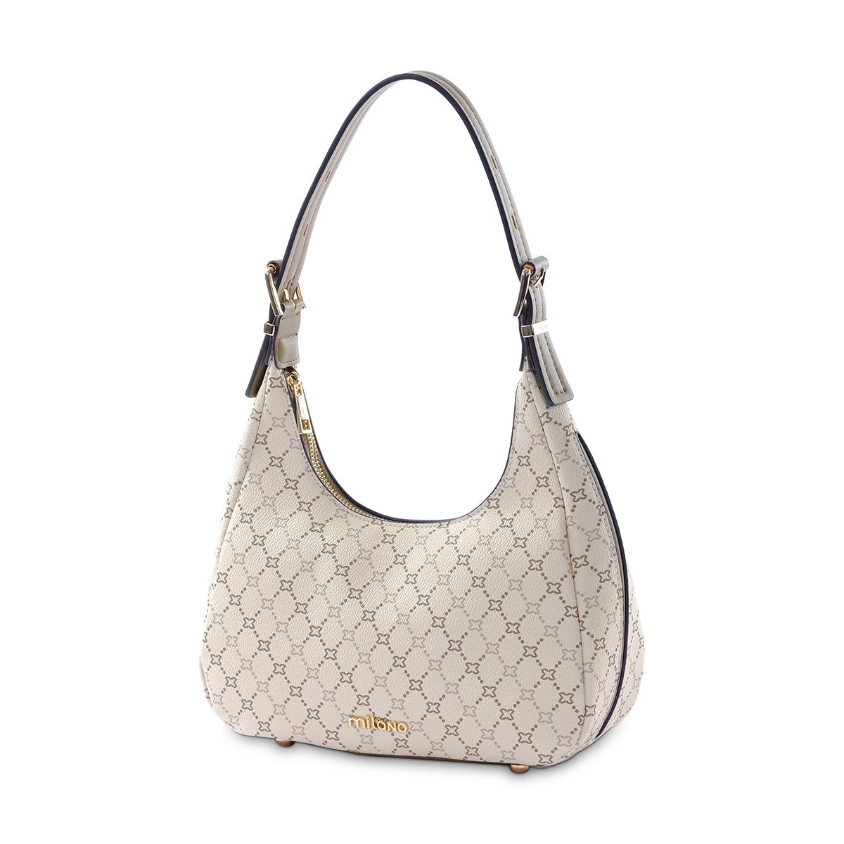 A stylish Beige tonal monogram shoulder bag with contrast Taupe handle, adjustable shoulder strap and Milano logo branding. Featuring multiple inner pockets and card slots to organise your essentials