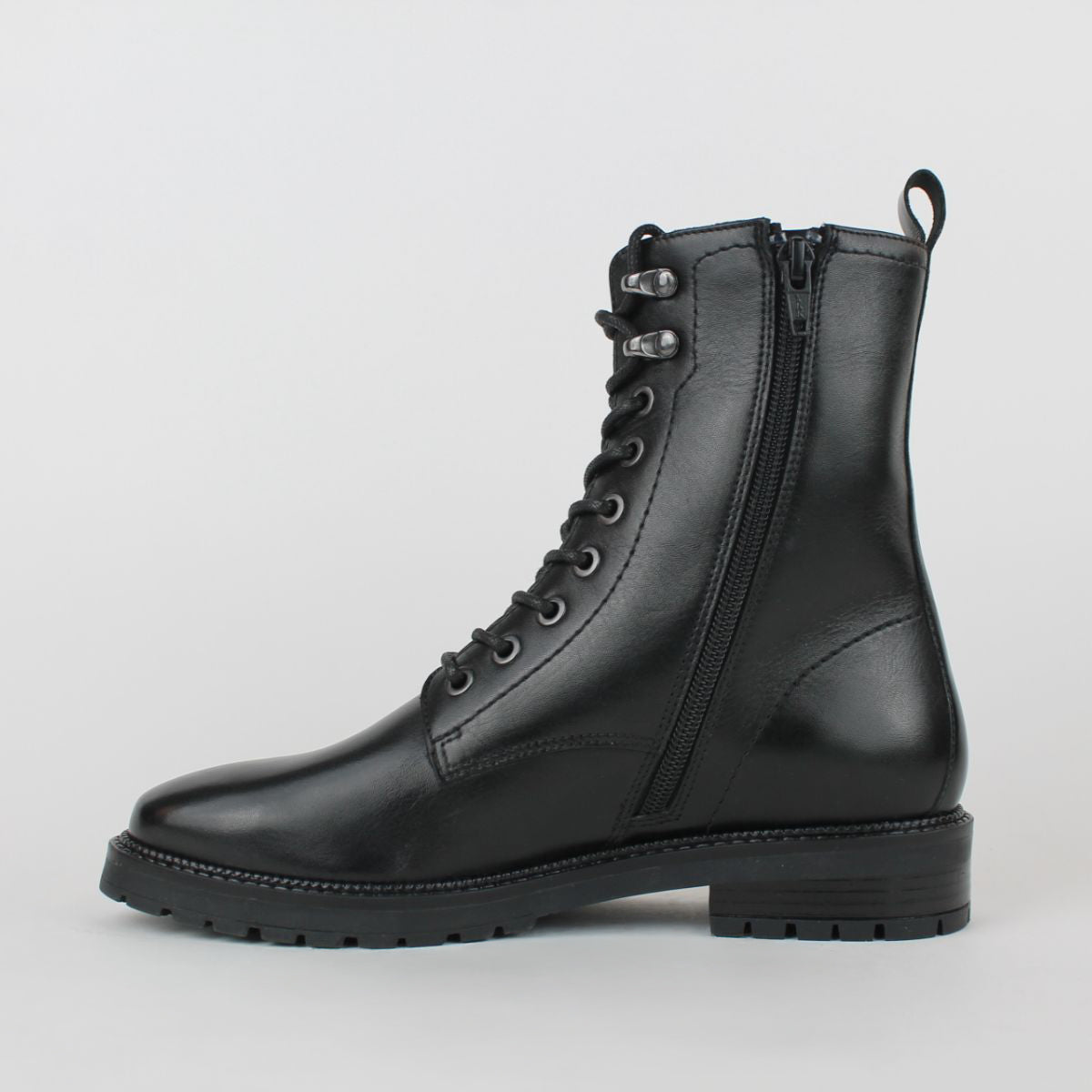 Classic Leather Biker Boot. Crafted from a premium leather upper, this boot combines rugged durability with a sleek, polished look. The lace-up front and sturdy lug sole give it an authentic biker feel, while the versatile black design makes it an essential piece for year-round styling.