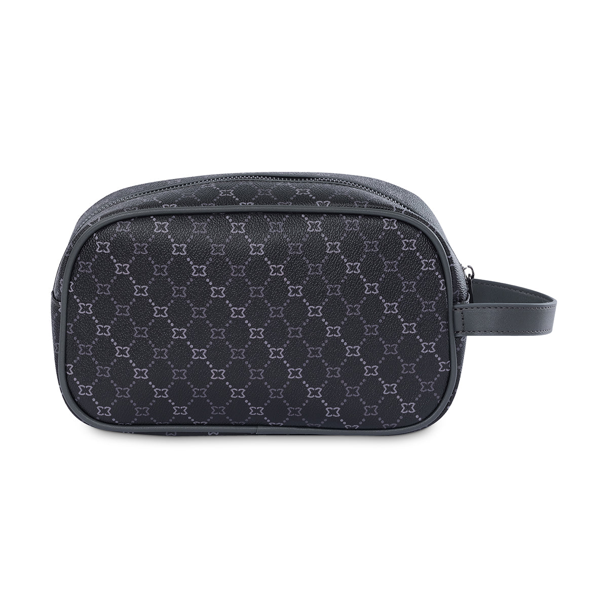 Black and grey toned monogram wash bag with embossed Milano plate, front zip pocket and grab handle