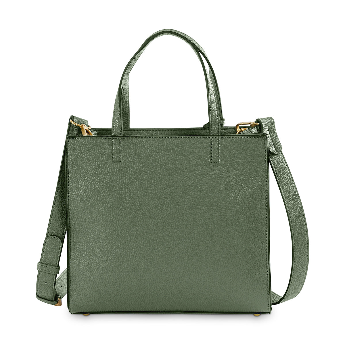 The 'Kennedy' tote in a rich khaki hue is a versatile statement piece. Designed with a structured body and twin top handles, this bag features a secure front clasp and a signature charm that adds a stylish detail. It's the perfect blend of modern elegance and functional design.