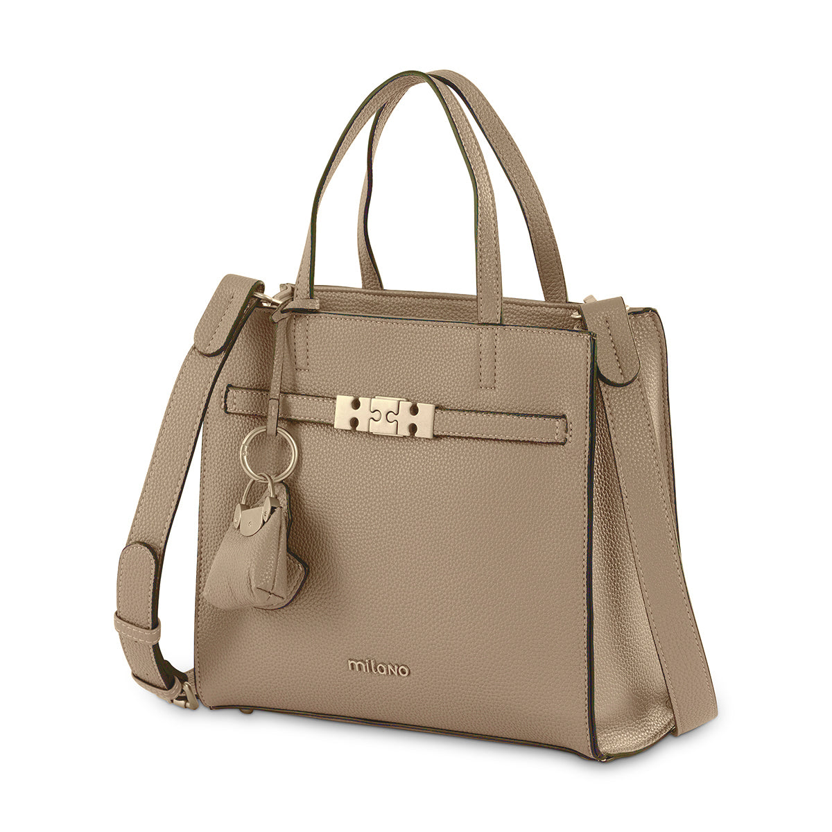 The 'Kennedy' tote in taupe is a sophisticated and playful accessory. Its structured silhouette and smooth finish give it a polished look, while the unique gold-toned lock and charming bunny-shaped key holder add a whimsical touch. This bag is a chic and spacious choice for your everyday needs.