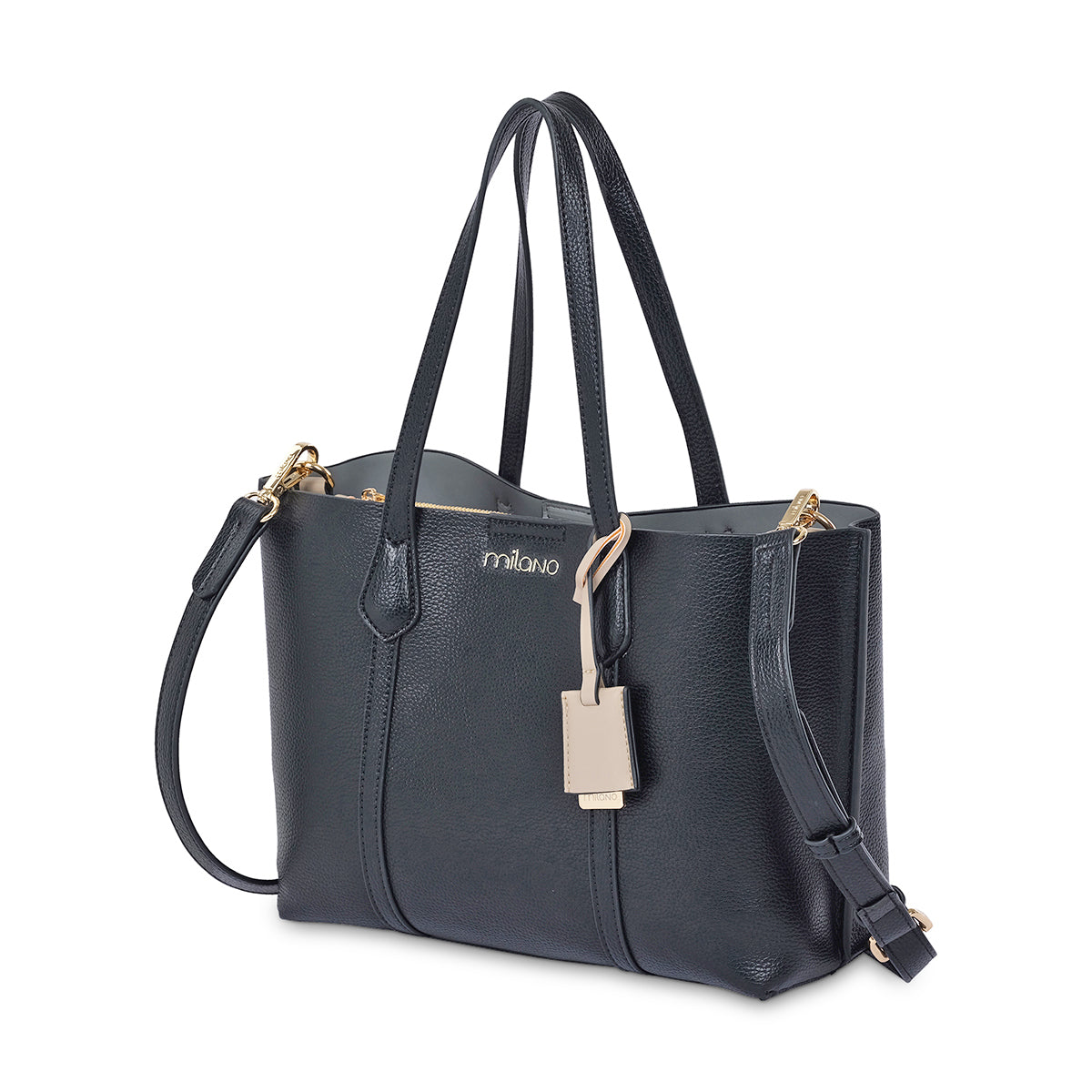 This black premium faux leather multiple compartment tote is a perfect workwear bag option with spacious interior, including central zip compartment and phone pockets to suit your needs. The contrast colour inner and detachable Milano luggage tag adds a modern edge