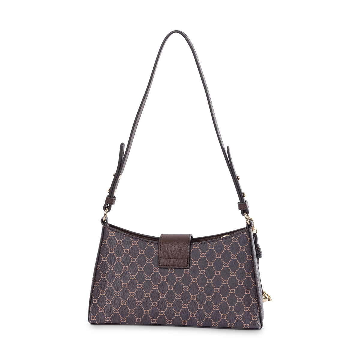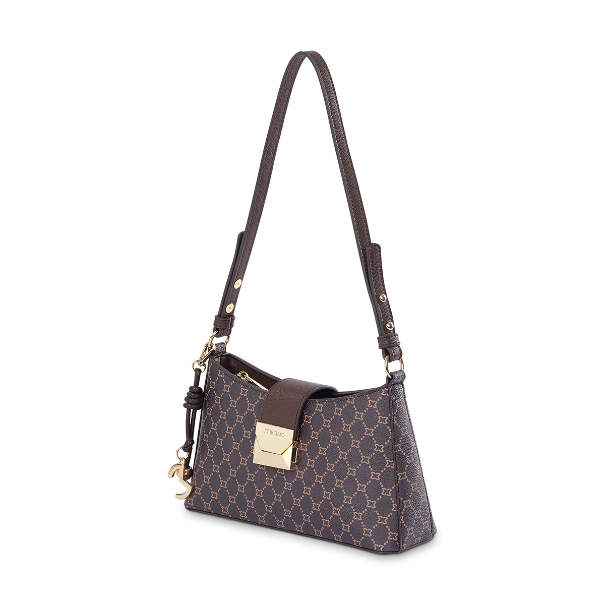 A brown monogram shoulder bag with premium geometric lock closure in addition to a secure zip compartment. Featuring detachable branded charms