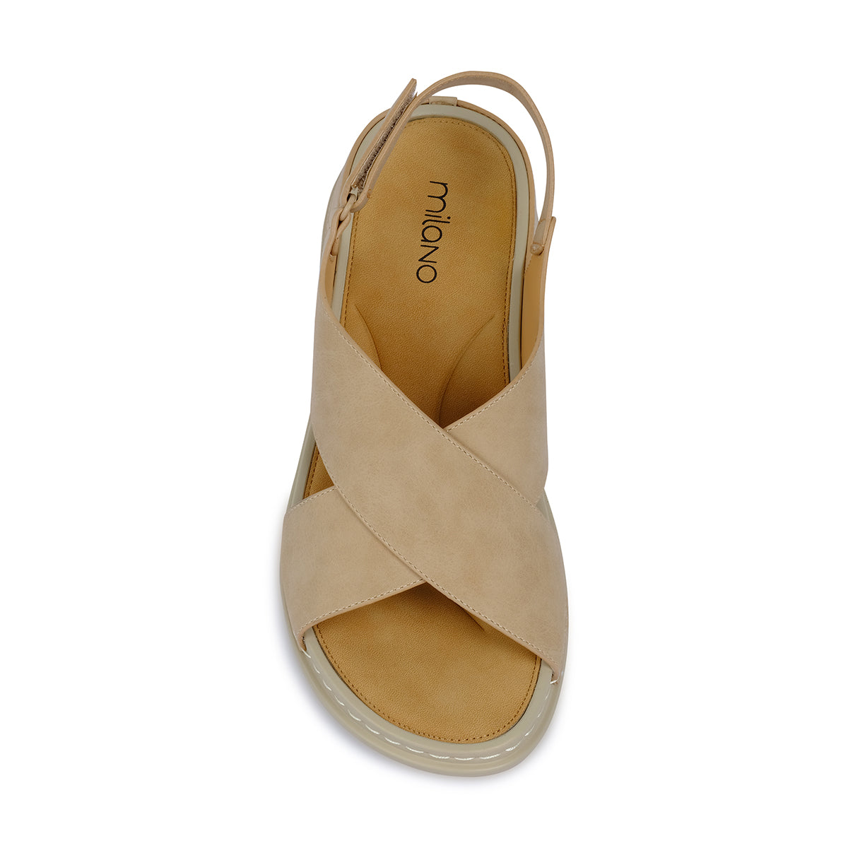 Comfortable beige sandals featuring wide cross straps and an adjustable slingback design. Built with a cushioned footbed and sturdy sole for all-day wear