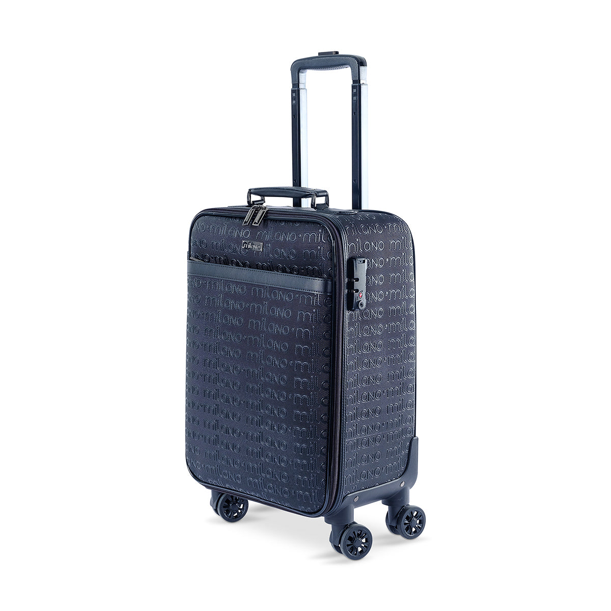 Meet the 'Rebecca' spinner suitcase, a perfect blend of durability and style. Crafted in a classic black finish with a subtle textured pattern, this luggage features 360° spinner wheels and a sturdy telescopic handle. Its minimalist design is completed by a small silver brand plaque.