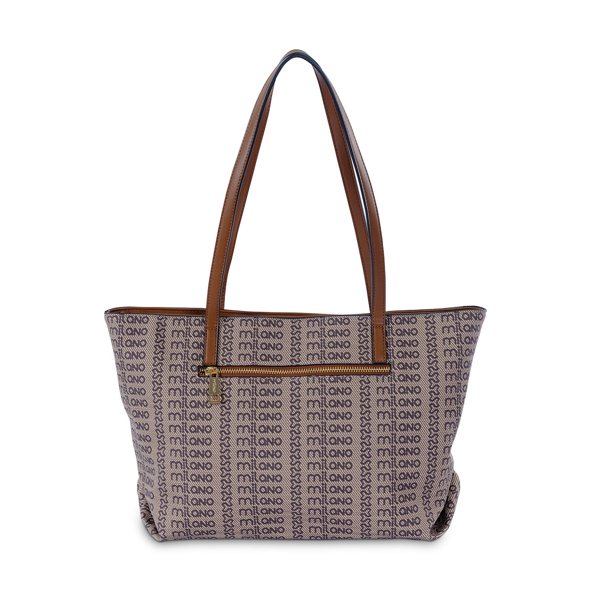 The 'Shakira' shopper is the perfect everyday tote for a woman on the go. This spacious bag features a stylish logo pattern, elegant brown leatherette handles, and a streamlined, open-top design. It's the ideal coordinating piece to complete your matching Shakira set.