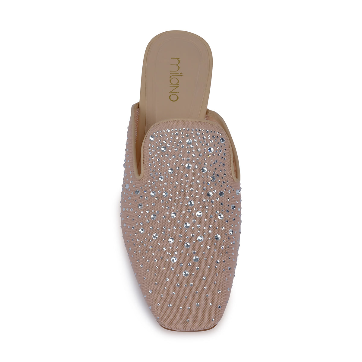 Chic slip-on mules in a nude tone, adorned with sparkling crystal embellishments. Designed with a sleek pointed toe and flat sole for effortless style and comfort.