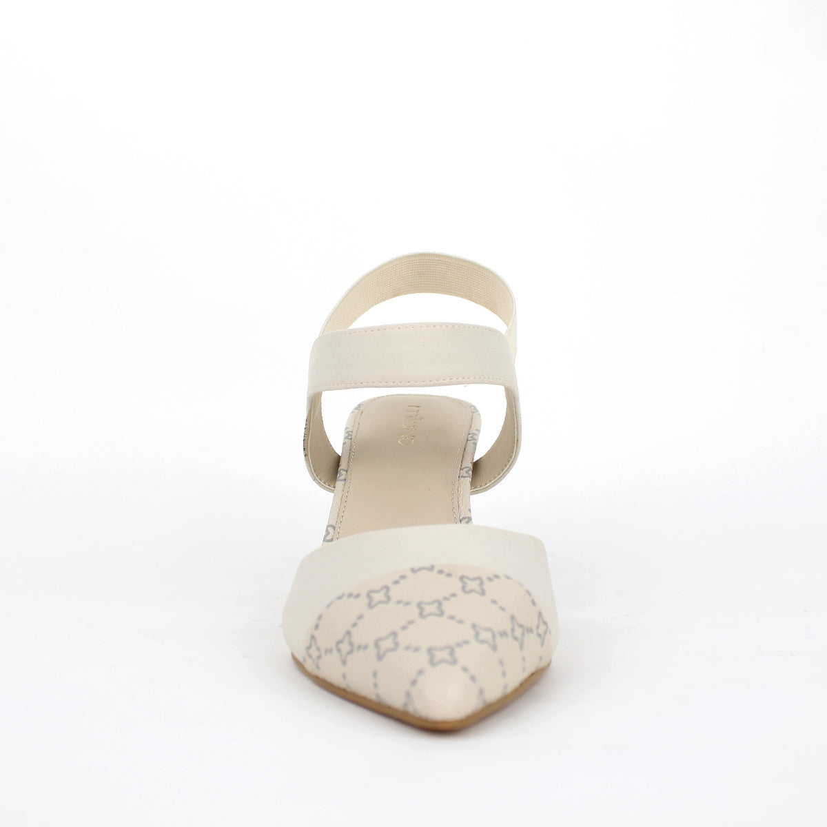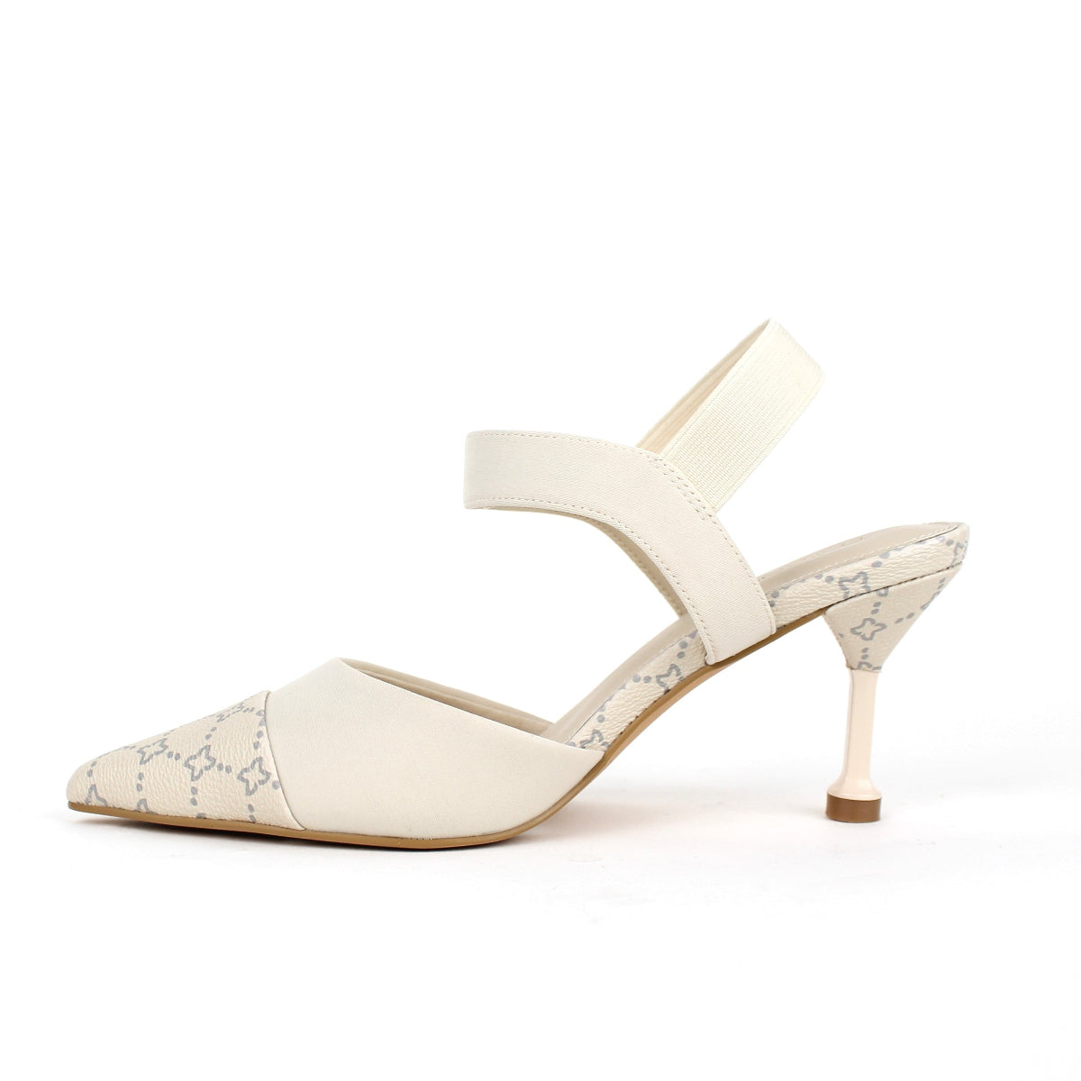 Step out in style with these modern ankle-strap pointed-toe pumps. The elegant off-white upper features a monogram pattern on the toe and heel, adding a touch of designer-inspired flair. These versatile shoes are perfect for transitioning from a day at the office to an evening event.