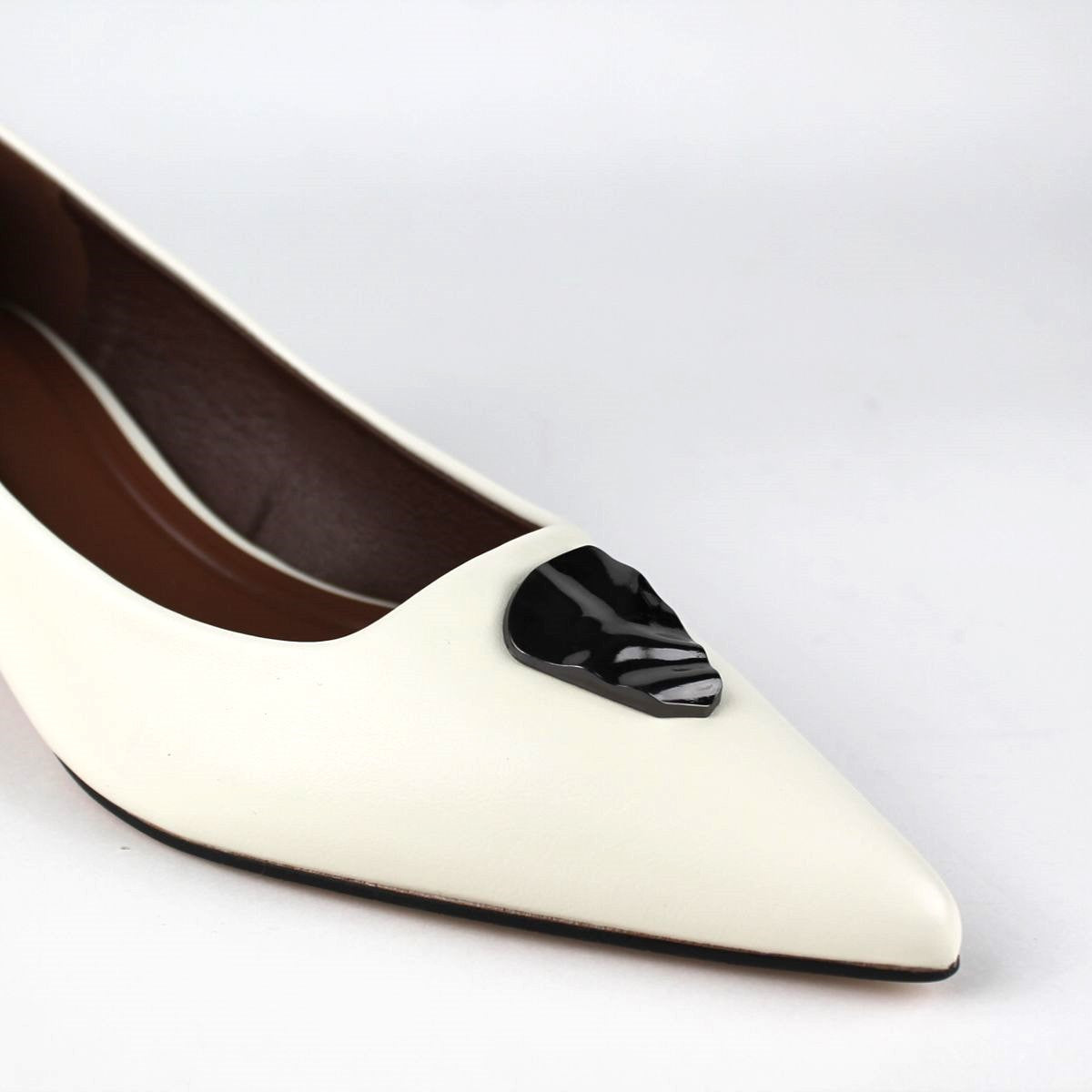 Elegant pumps featuring a sleek pointed toe and a sophisticated kitten heel. Crafted from smooth leather, these shoes are adorned with a polished, decorative buckle on the front. A perfect choice for adding a touch of class to both professional and evening ensembles.