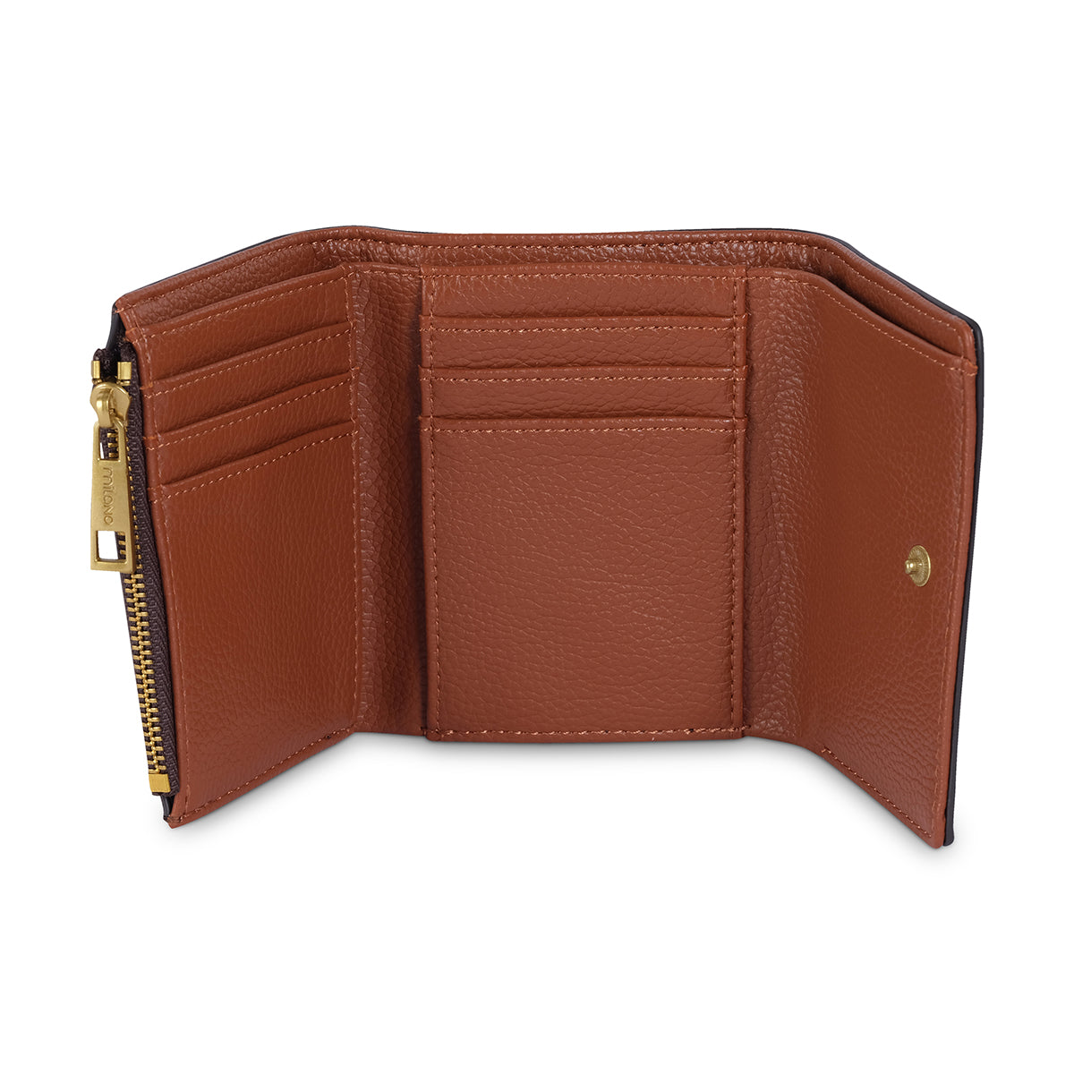 Brown monogram trifold wallet featuring M branded plate, with ample card slots and internal money compartment