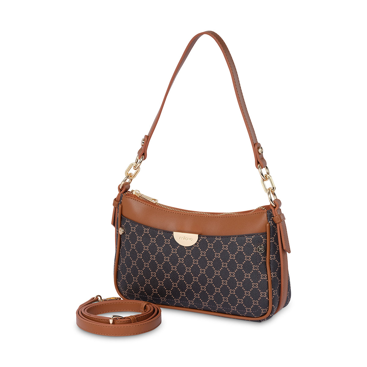 Brown monogram shoulder bag featuring Milano branded plate, textured gold links and faux leather handles. With internal pockets and external slip pocket to organise your daily essentials