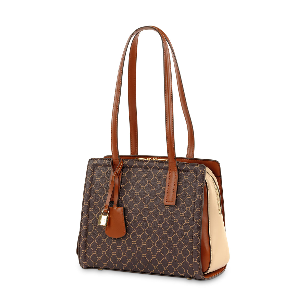 This elegant handbag features a classic rectangular shape with a structured design in dark material, complemented by rich brown handles. Gold hardware and a dangling key charm add a refined touch. It includes a secure zip closure, subtle branded nameplate, and multiple interior compartments for easy organization—perfect for both casual and formal wear.