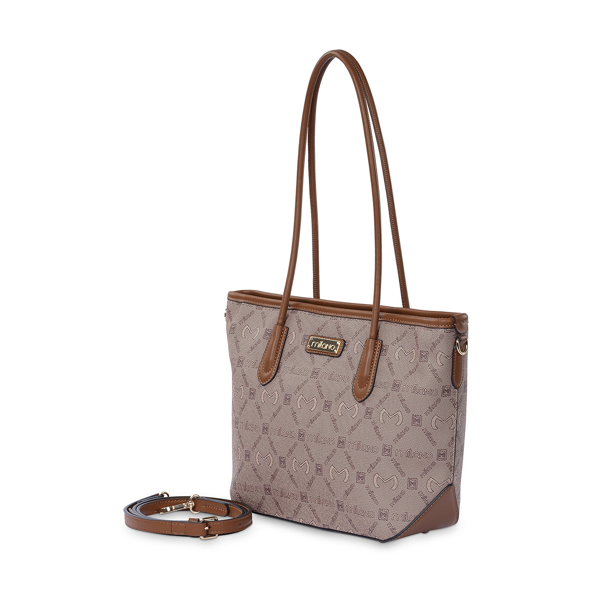 Elevate your look with the 'Milano' handbag, a structured tote that blends professional style with modern details. This bag features a timeless monogram pattern on a neutral beige base, accented by a contrasting brown trim. The spacious interior and multiple carrying options make it an ideal choice for both the office and weekend getaways