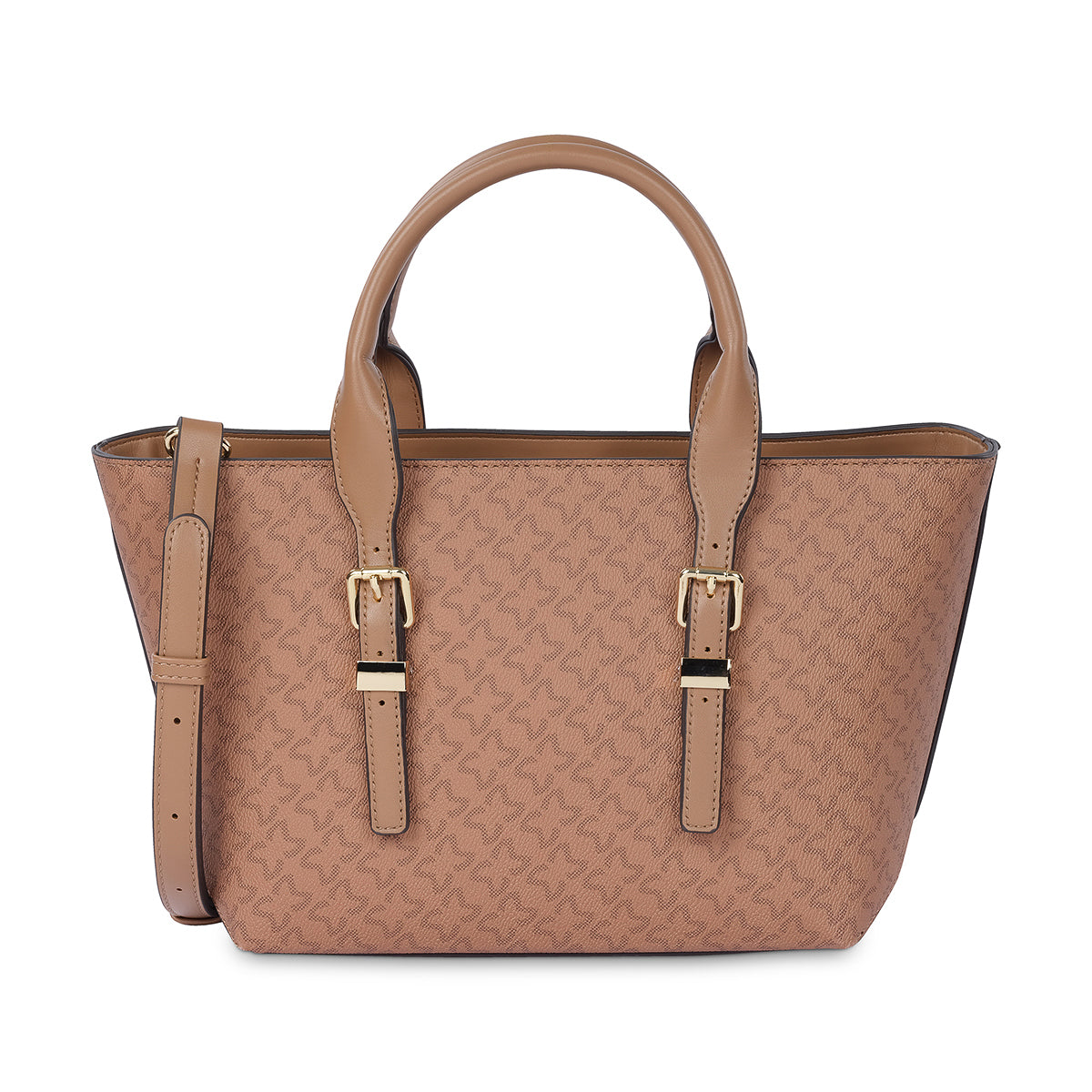 Carry your essentials in sophisticated style with our structured beige tote bag. Featuring a chic geometric "Milano" pattern and contrasting brown handles, it's accented by prominent gold-tone buckles. With a secure zip top and a versatile detachable strap, this bag is a perfect blend of elegance and practicality.