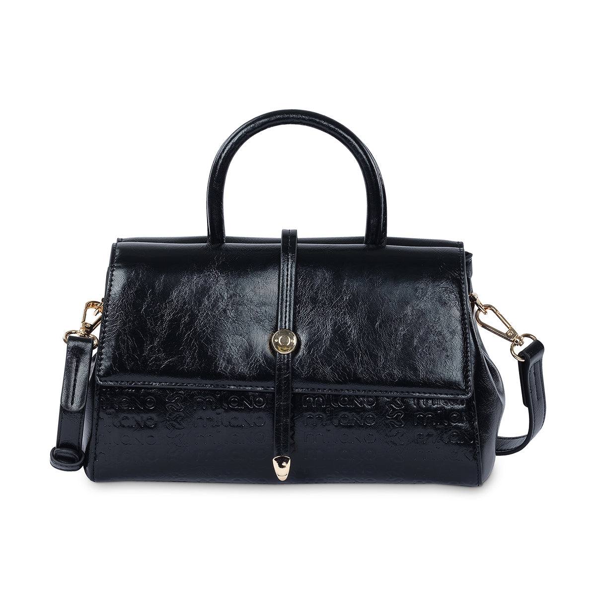 Meet the 'Milano' structured bag, a classic accessory that blends professional style with modern details. The bag is crafted in a sleek black finish with a top handle and a detachable shoulder strap. Its distinctive front flap is detailed with embossed squares and polished buckle hardware, making it a perfect statement piece from the office to an evening out