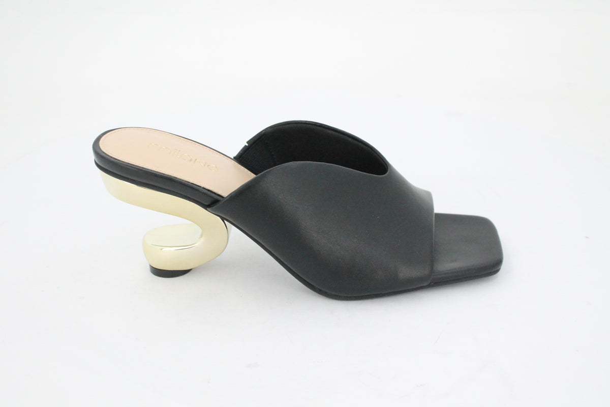 Step out in style with these Karmen Heel Mules. Crafted from smooth black leather like finished, these mules feature a unique, sculptural gold-tone heel and sole that elevates any look. The open back and square toe add a modern touch, making them a statement piece for any fashion-forward wardrobe.