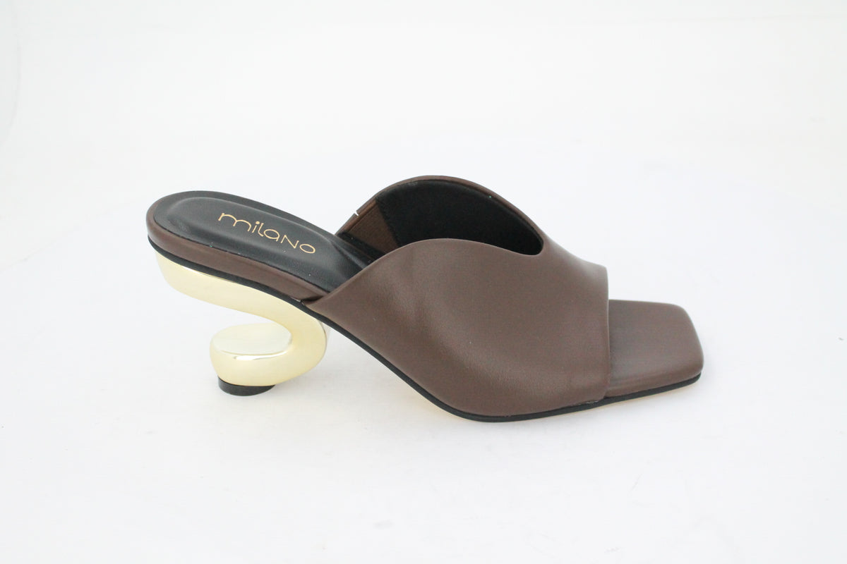 Step out in style with these Karmen Heel Mules. Crafted from smooth chocolate brown leather like finished, these mules feature a unique, sculptural gold-tone heel and sole that elevates any look. The open back and square toe add a modern touch, making them a statement piece for any fashion-forward wardrobe.