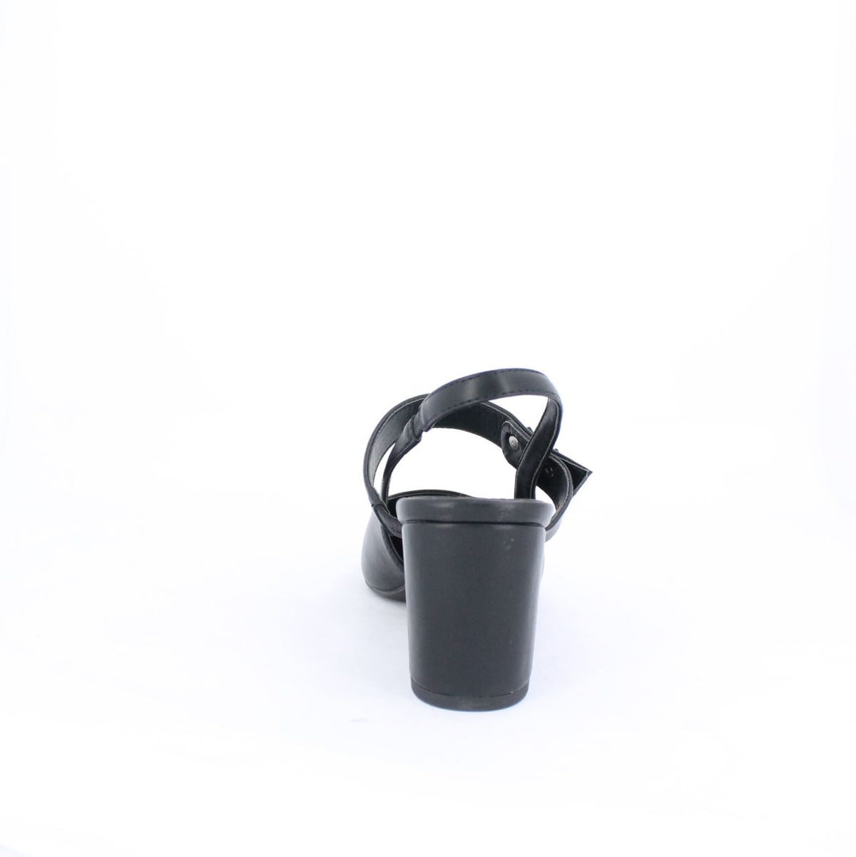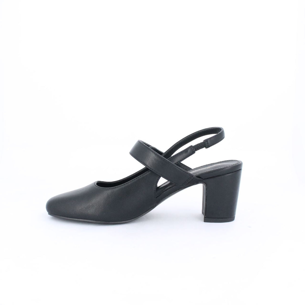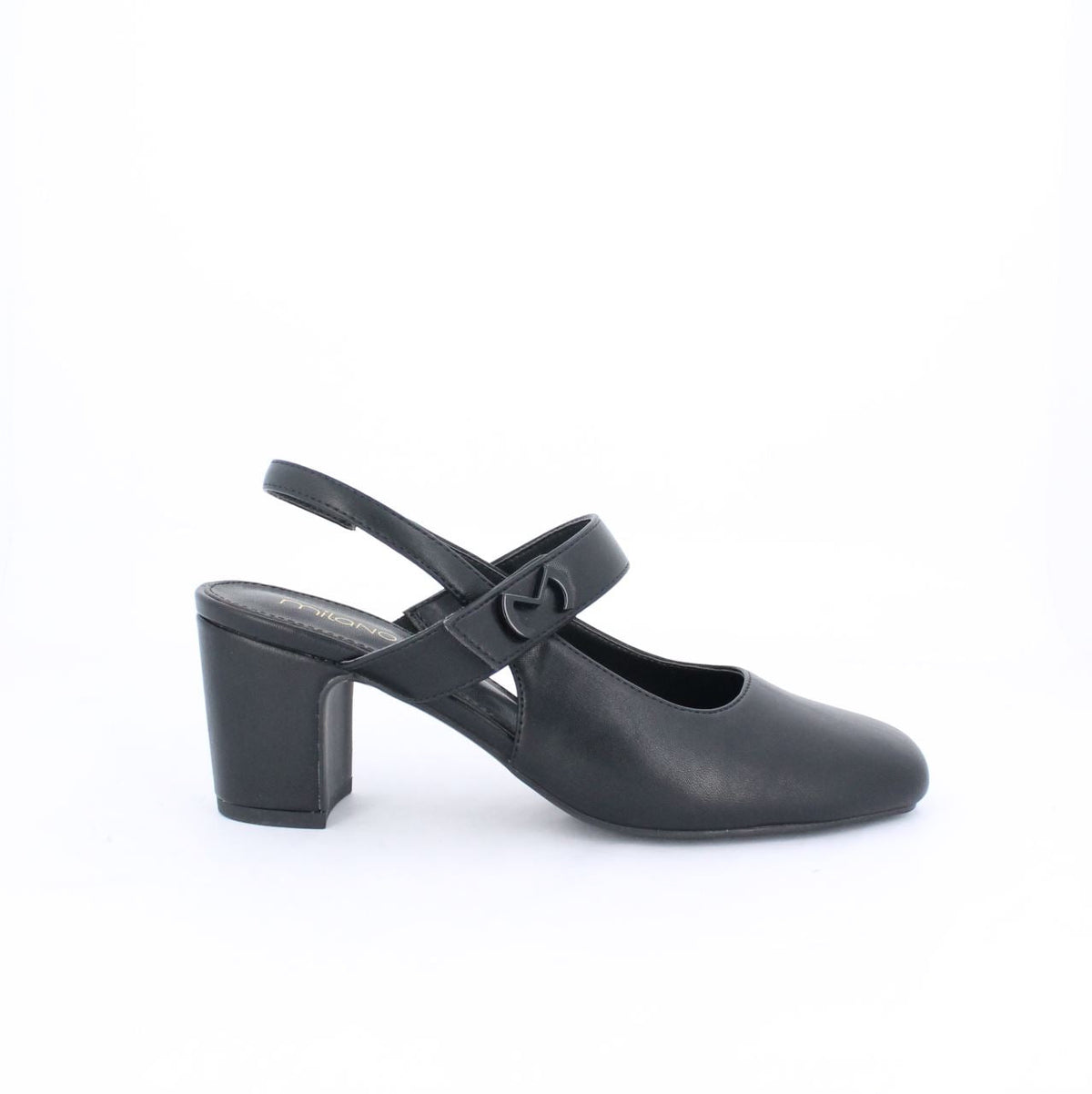 Marcedita slingback block-heeled shoe with a square toe. It has a wide strap across the top, adorned with a gold-tone "M" metal trim logo, adding a touch of elegance. The heel is chunky and of moderate height, providing both style and comfort.