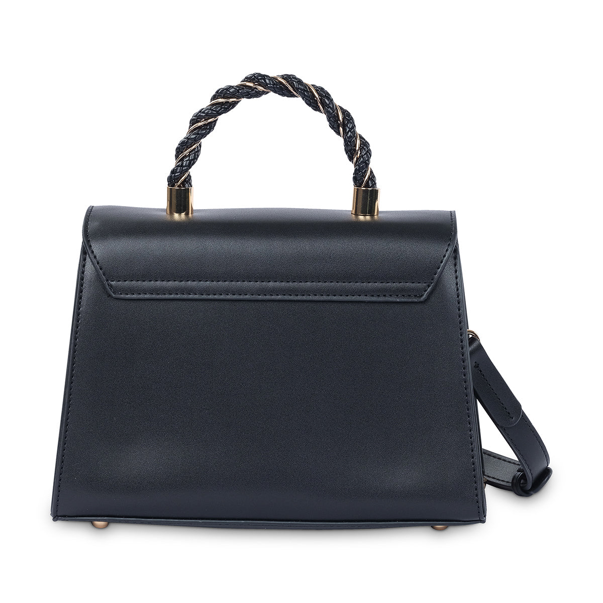 A sophisticated large black satchel with twisted, woven handle detailing alongside a premium drop lock closure. The inner features a zip pocket for additional security and an adjustable strap provides the option of styling as a crossbody bag as well as a cute grab bag. Matching footwear available