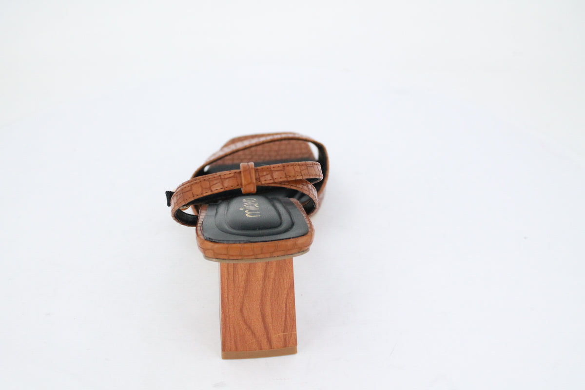 Elevate your look with these stylish REMIE Ankle Strap Heeled Sandals. Featuring a chic square toe, gold-toned sole and a distinctive wood-look block heel, these sandals offer a modern and sophisticated touch. The adjustable ankle strap ensures a secure and comfortable fit, making them perfect for dressing up any outfit.
